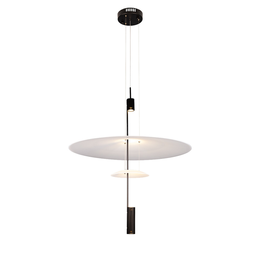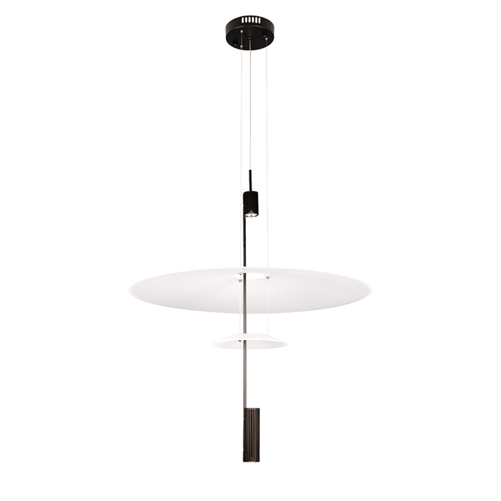 Сучасна декоративна підвісна LED люстра з нейтральною температурою кольору 4000K, без пульта управління. Незвичайний дизайн люстри представлений у вигляді конструкції з двох пластикових плафонів на одній осі, які мають форму тарілок різних розмірів. Білі матові плафони м'яко розсіюють світло та створюють приємний затишний ефект.