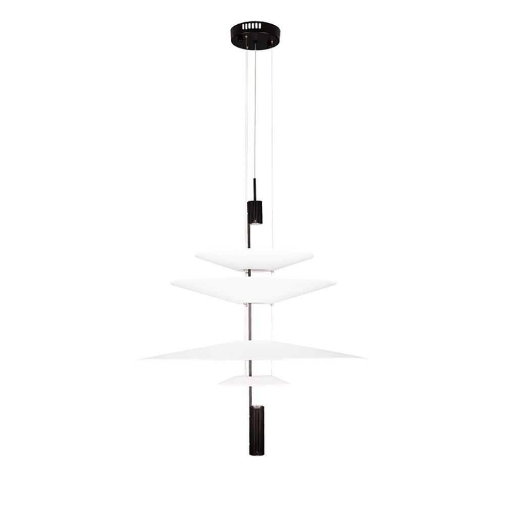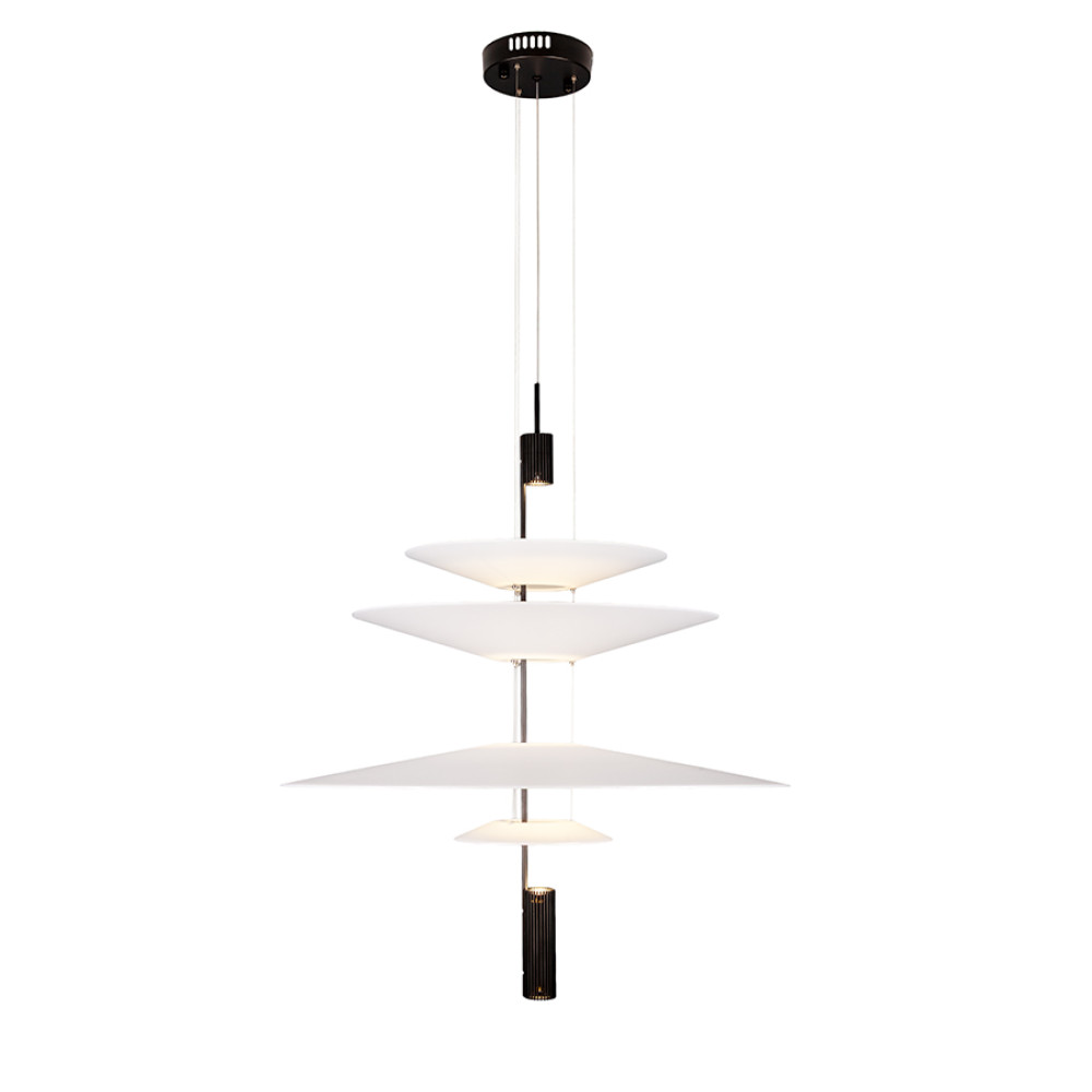 Сучасна декоративна підвісна LED люстра з нейтральною температурою кольору 4000K, без пульта управління. Незвичайний дизайн люстри представлений у вигляді конструкції з чотирьох пластикових плафонів на одній осі, які мають форму тарілок, різних розмірів. Білі матові плафони м'яко розсіюють світло та створюють приємний затишний ефект.