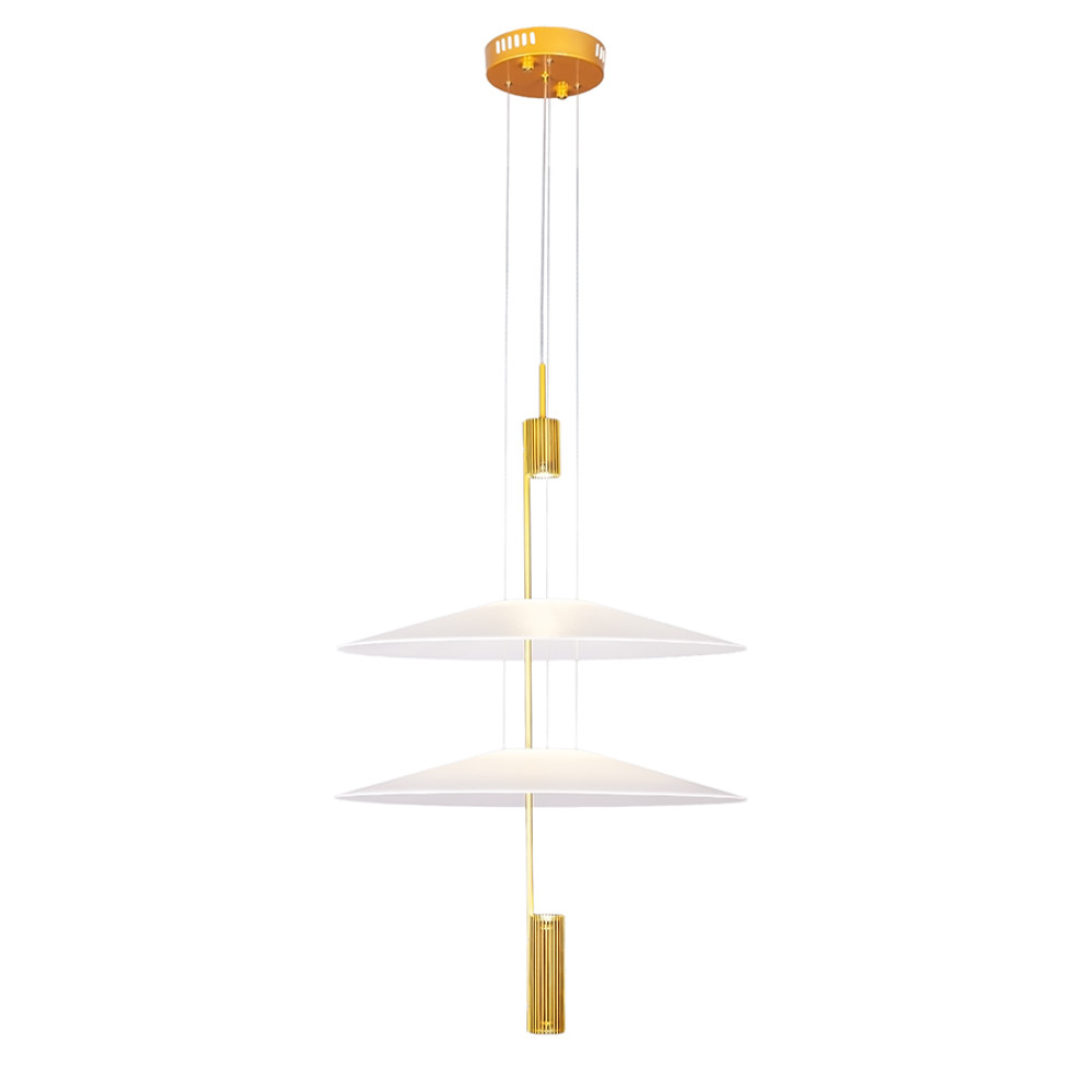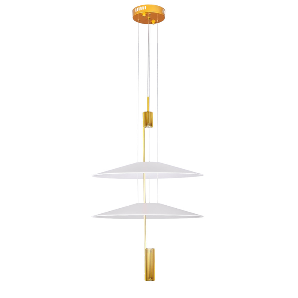 Сучасна декоративна підвісна LED люстра з нейтральною температурою кольору 4000K, без пульта управління. Незвичайний дизайн люстри представлений у вигляді конструкції з двох пластикових плафонів на одній осі, які мають форму тарілок. Білі матові плафони м'яко розсіюють світло та створюють приємний затишний ефект.