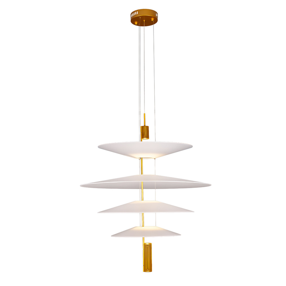 Сучасна декоративна підвісна LED люстра з нейтральною температурою кольору 4000K, без пульта управління. Незвичайний дизайн люстри представлений у вигляді конструкції з чотирьох пластикових плафонів на одній осі, які мають форму тарілок, різних розмірів. Білі матові плафони м'яко розсіюють світло та створюють приємний затишний ефект.