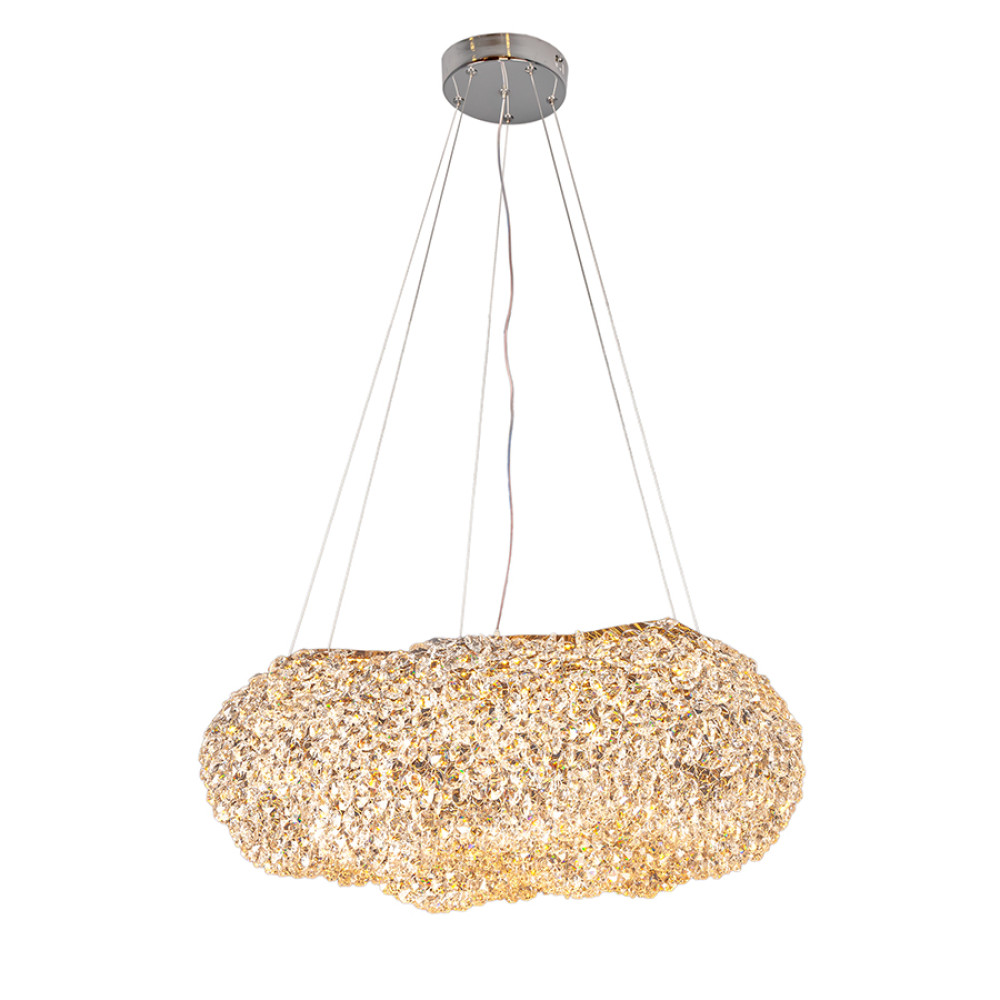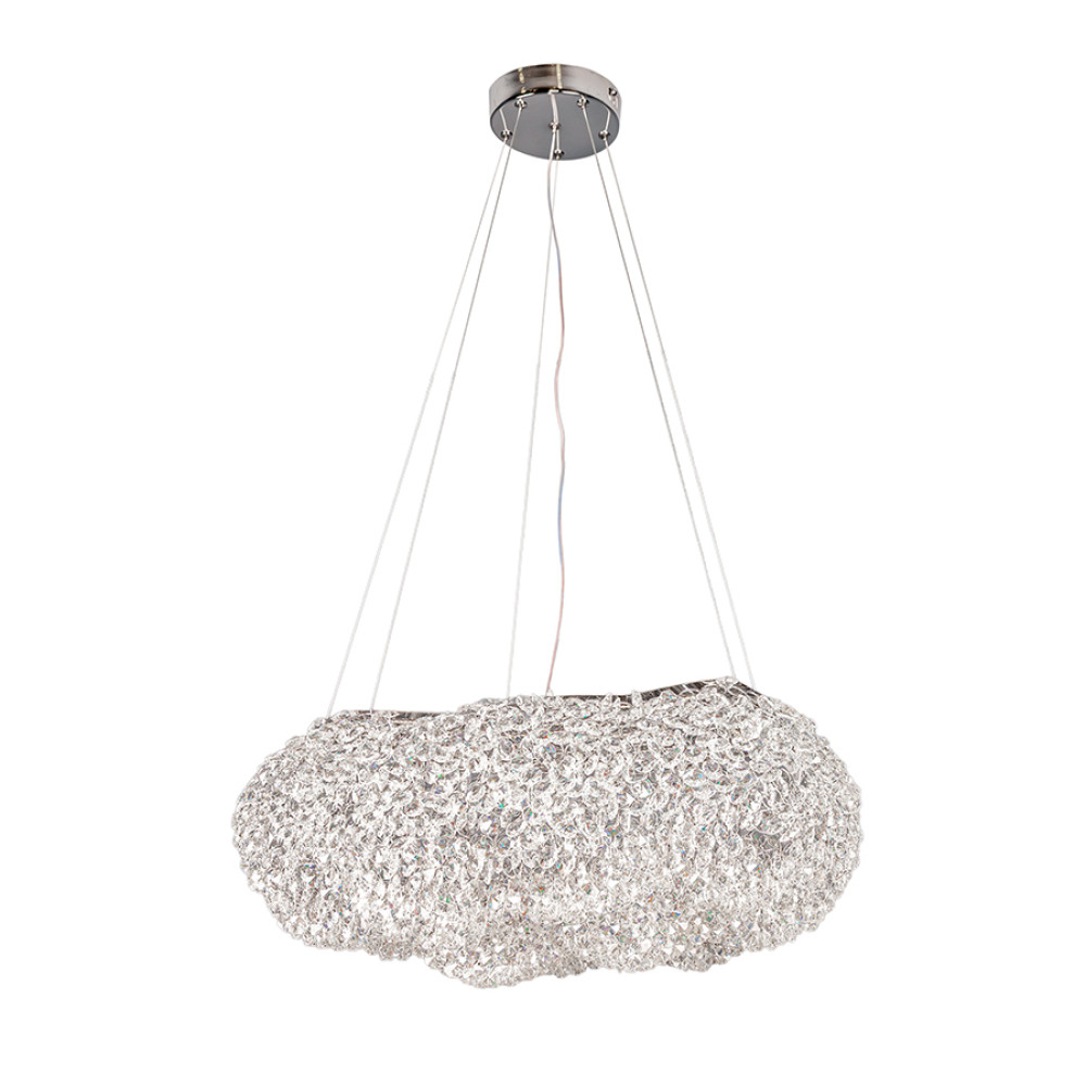 Сучасна підвісна LED люстра на одне джерело світла з вбудованими світлодіодами та плафоном, що має форму хмаринки, що складається з безлічі кришталевих камінців. Така незвичайна конструкція створює вражаючий блискучий світловий ефект: що цікаво проявляється при включеному джерелі світла. Люстра оснащена функцією вибору колірної температури, з пультом дистанційного управління.