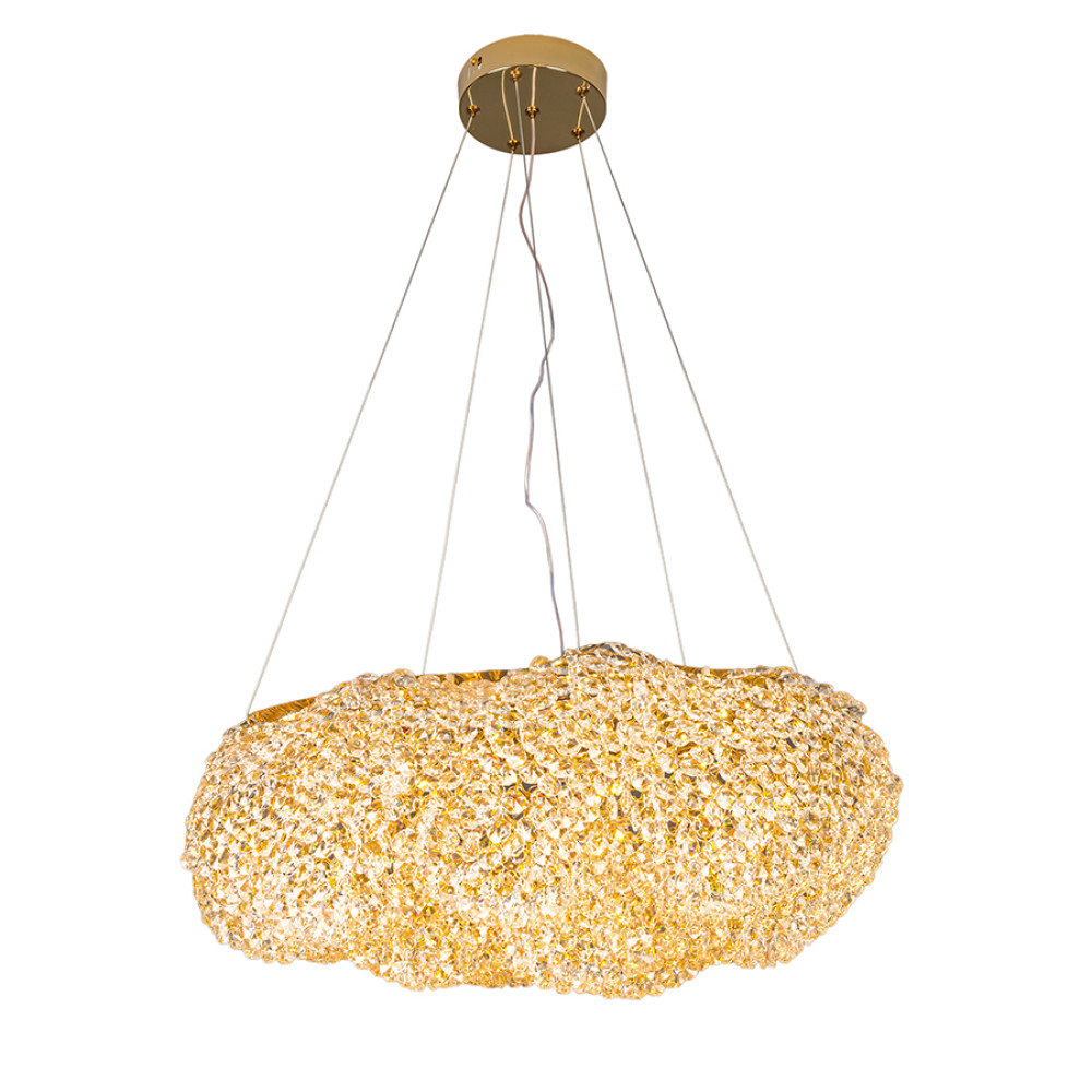 Сучасна підвісна LED люстра на одне джерело світла з вбудованими світлодіодами та плафоном, що має форму хмаринки, що складається з безлічі кришталевих камінців. Така незвичайна конструкція створює вражаючий блискучий світловий ефект: що цікаво проявляється при включеному джерелі світла. Люстра оснащена функцією вибору колірної температури, з пультом дистанційного управління.