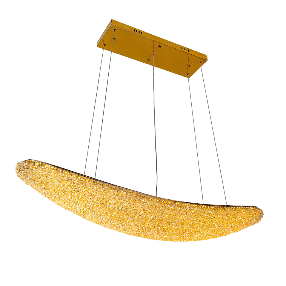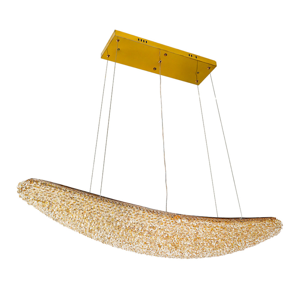 Сучасна підвісна LED люстра на одне джерело світла у вигляді довгої планки вигнутої форми з вбудованими світлодіодами та плафоном, який складається з безлічі кришталевих камінців. Така незвичайна конструкція створює вражаючий блискучий світловий ефект: що цікаво проявляється при включеному джерелі світла. Люстра оснащена функцією вибору колірної температури, з пультом дистанційного управління.