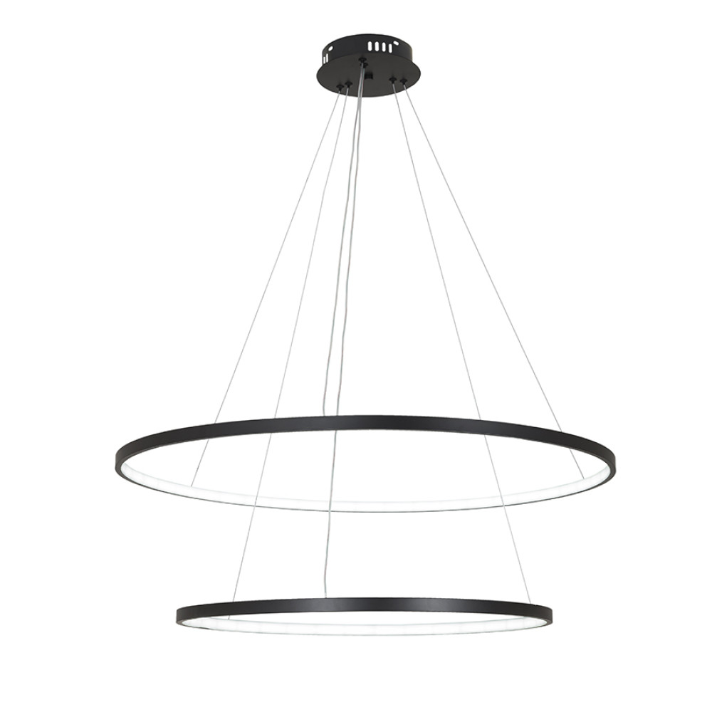 Підвісна декоративна LED люстра у сучасному стилі на два джерела світла у вигляді світлодіодних кілець. Люстра оснащена пультом керування, регулюванням температури свічення.