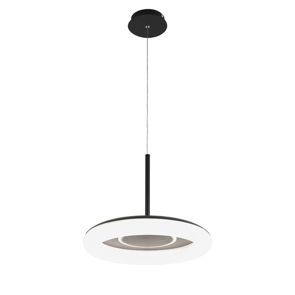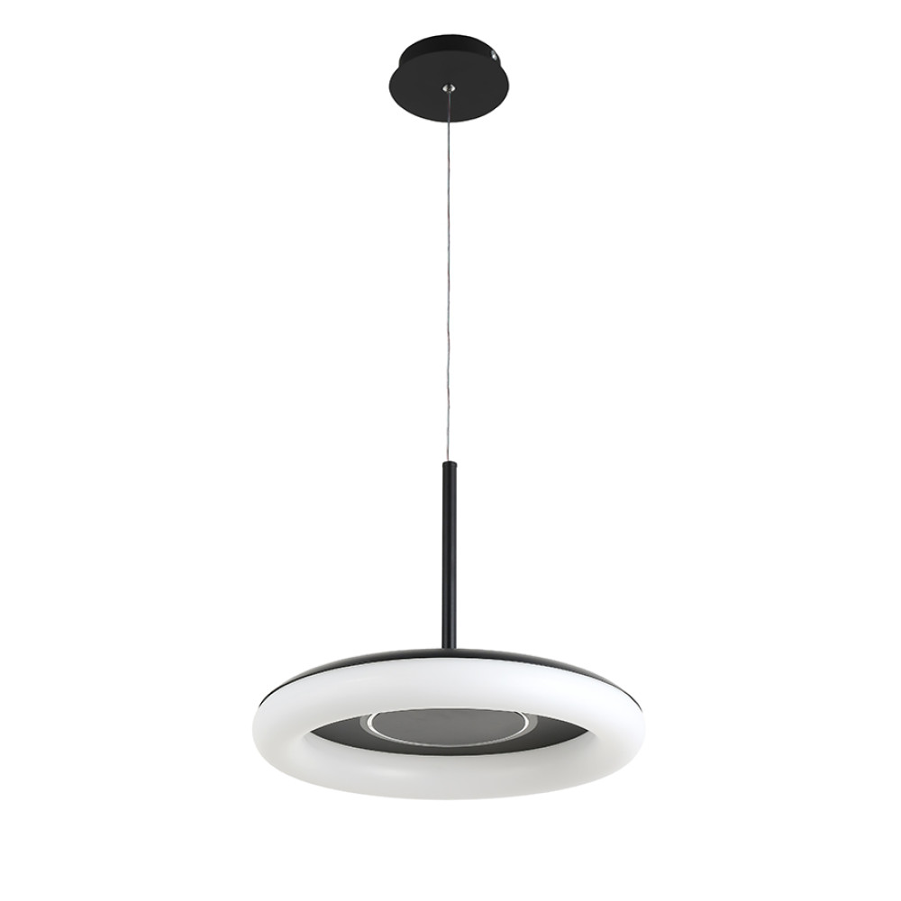 Сучасна декоративна підвісна LED люстра на джерело світла з регулюванням колірної температури, без пульта управління. Незвичайний дизайн люстри представлений у вигляді світлодіодного кільця на плоскому корпусі.