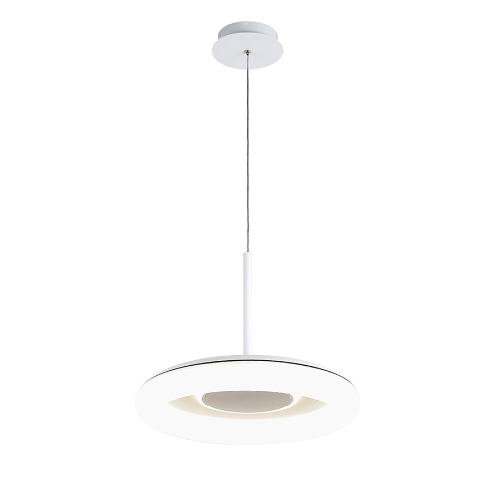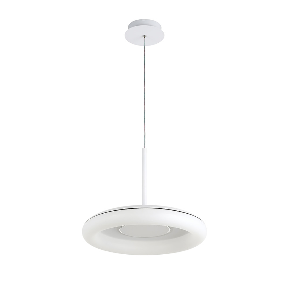 Сучасна декоративна підвісна LED люстра на джерело світла з регулюванням колірної температури, без пульта управління. Незвичайний дизайн люстри представлений у вигляді світлодіодного кільця на плоскому корпусі.