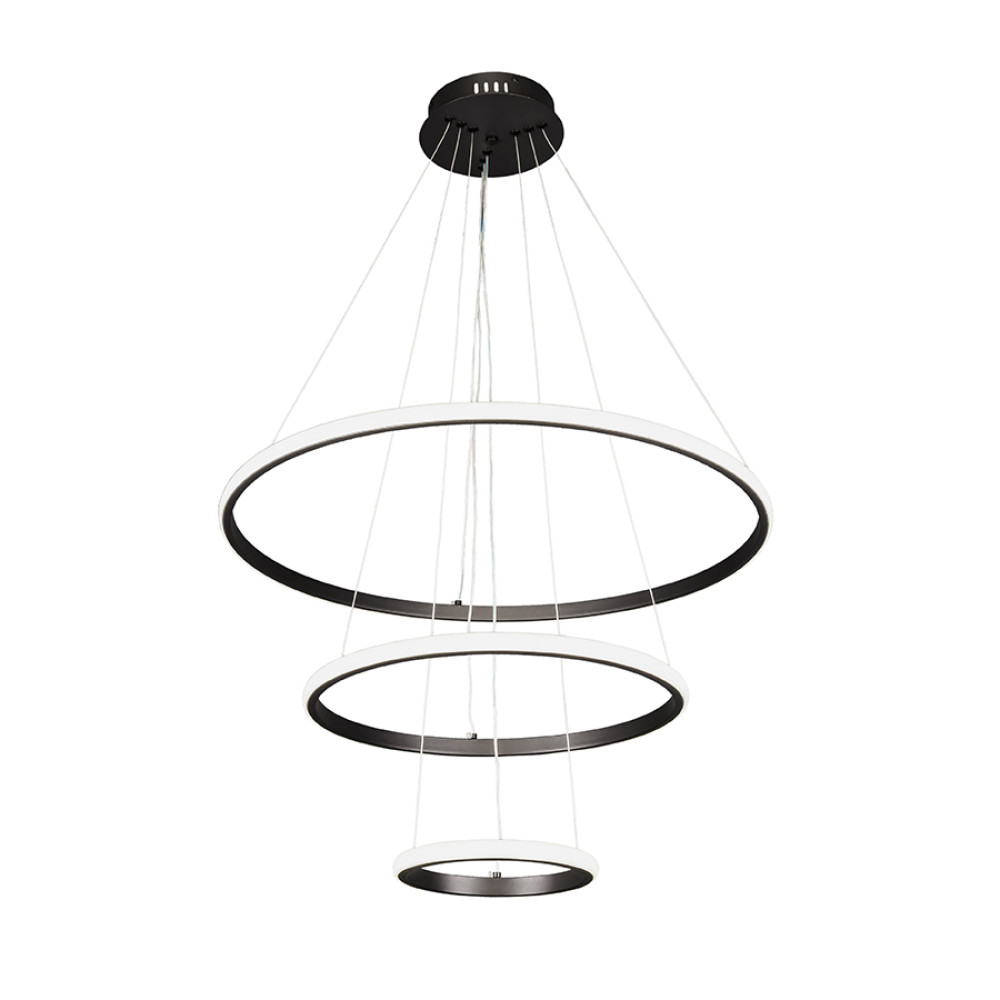 Підвісна сучасна LED люстра на три джерела світла у вигляді світлодіодних кілець діаметром 20 см, 40 см, 60 см. Люстра оснащена пультом управління з регулюванням температури свічення.