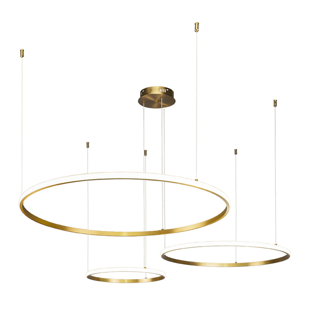 Підвісна сучасна LED люстра на три джерела світла у вигляді світлодіодних кілець діаметром 40см, 60см, 80см. Люстра оснащена пультом керування з регулюванням температури свічення.