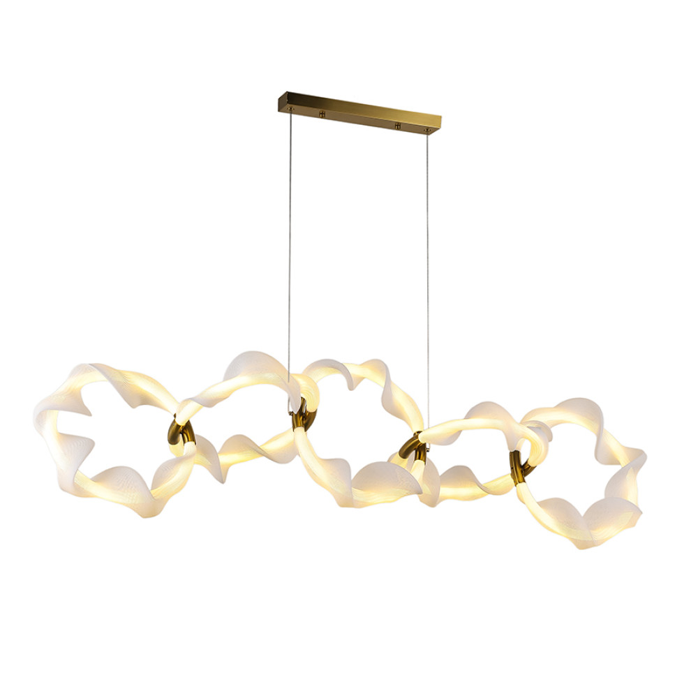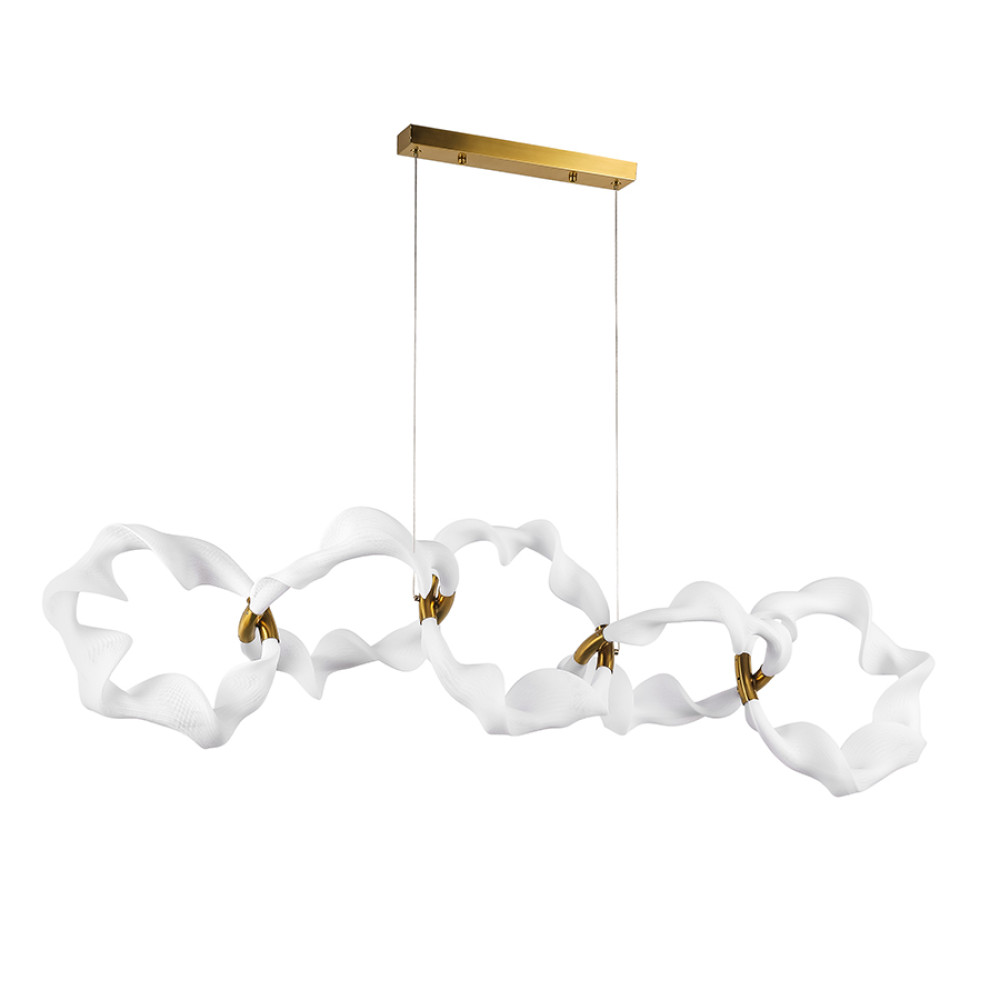 Декоративна світлодіодна люстра в сучасному стилі на п'ять джерел світла. Незвичайний дизайн люстри представляє собою підвісну горизонтальну конструкцію у вигляді ланцюжка з п'яти жорстко з'єднаних LED-кілець з білим абажуром і бронзовою фурнітурою.