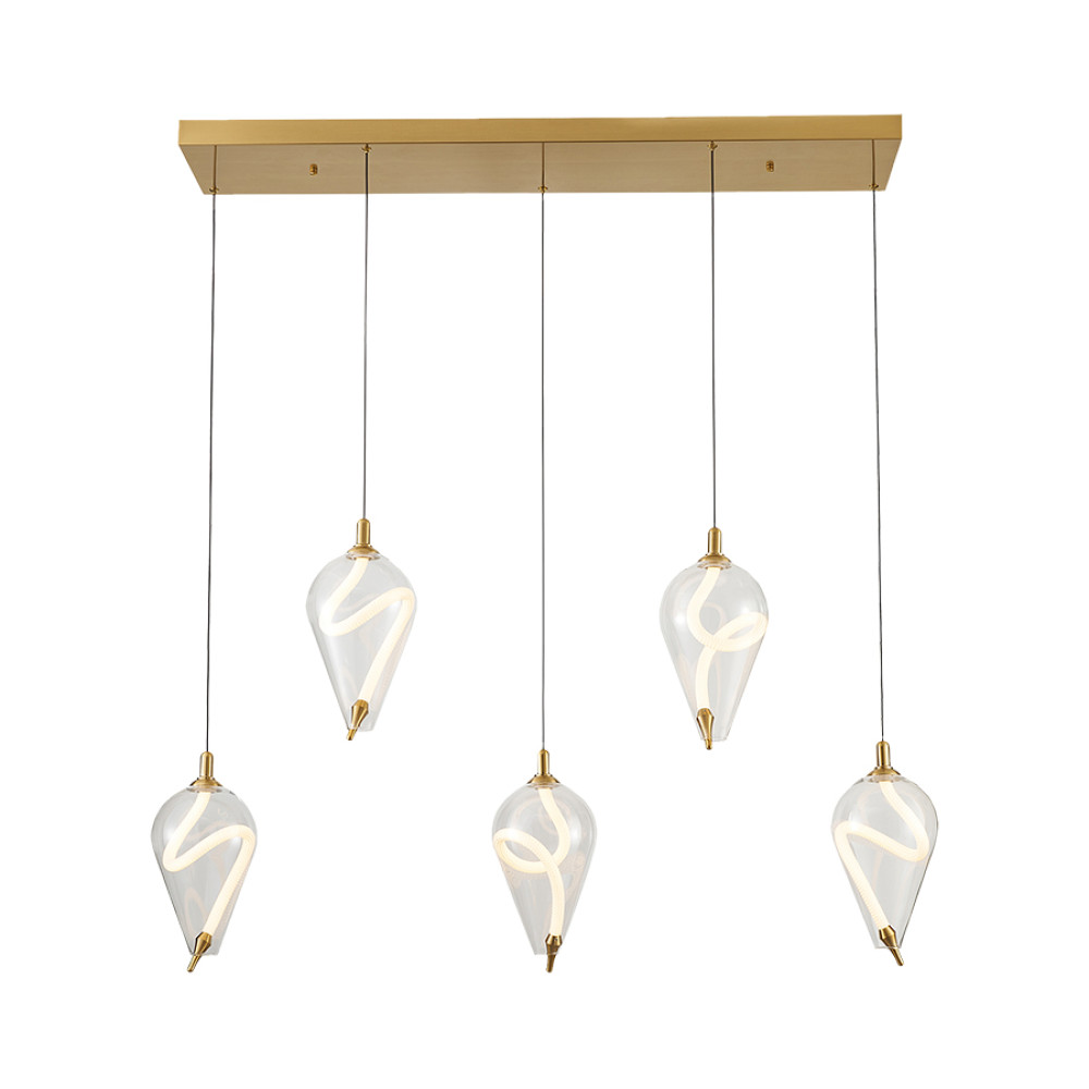 Сучасна декоративна підвісна LED люстра на п'ять джерел світла з регульованою колірною температурою та металевим корпусом прямокутної форми. Незвичайний дизайн люстри представлений у вигляді вигнутих світлодіодних стрижнів зі скляними плафонами конічної форми.