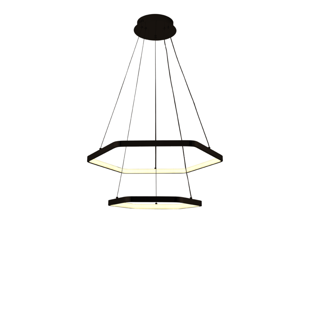 Підвісна декоративна LED люстра у сучасному стилі на два джерела світла у вигляді світлодіодних шестикутників. Люстра оснащена пультом керування, регулюванням температури свічення. Найкраще використовувати у приміщенні загальною площею 22 м. кв.
