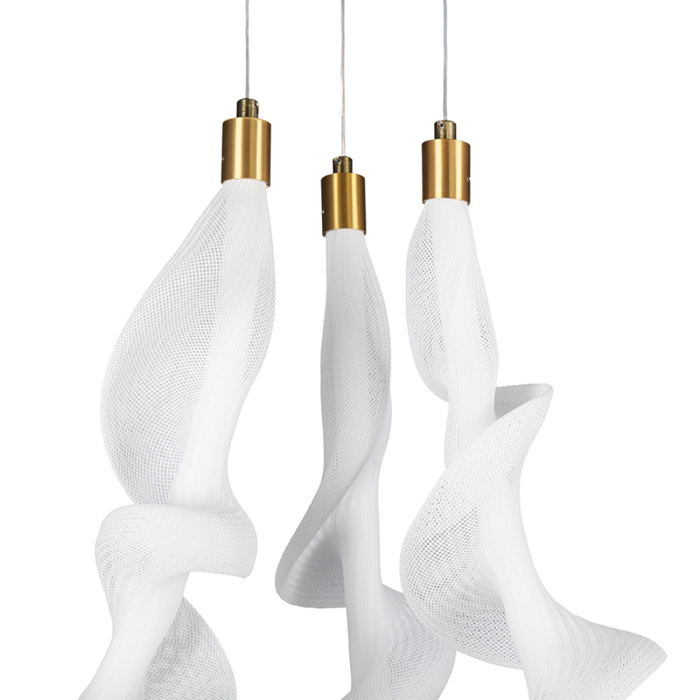 Декоративна світлодіодна підвісна в сучасному стилі на три джерела світла у вигляді кривої планки з тканинним абажуром.