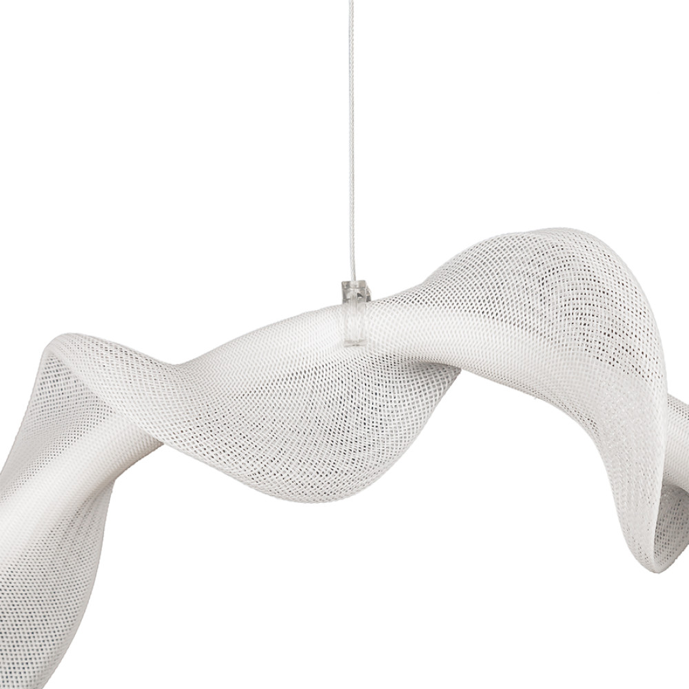 Декоративна світлодіодна люстра в сучасному стилі на одне джерело світла у вигляді кривої планки з тканинним абажуром.