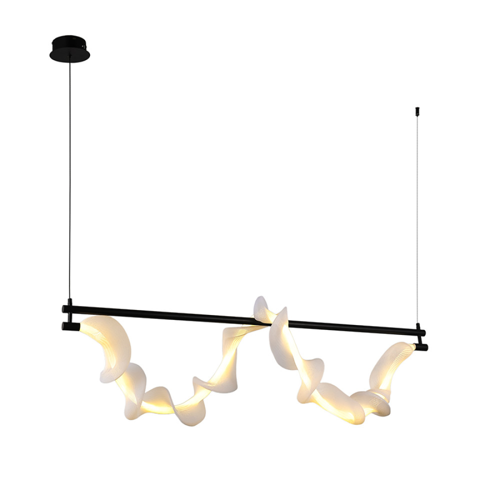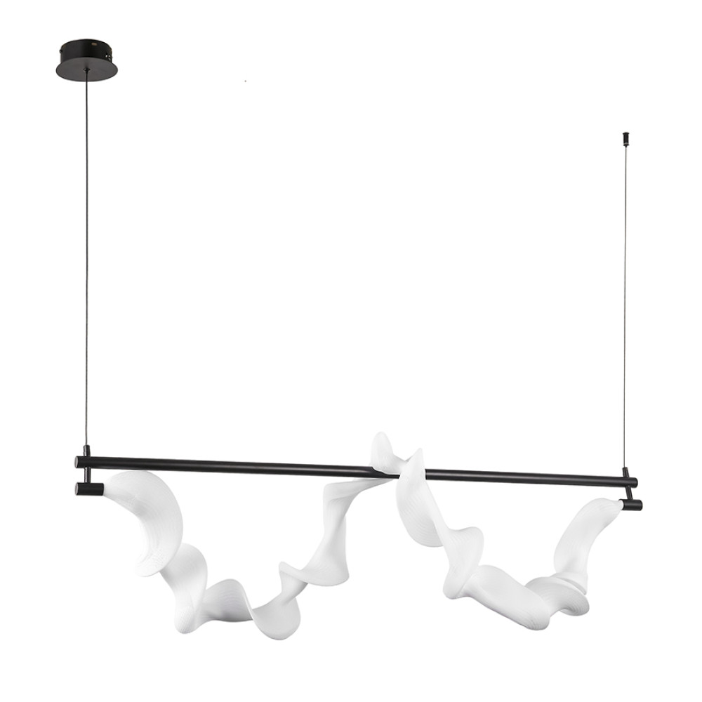 Декоративна світлодіодна люстра в сучасному стилі на одне джерело світла. Незвичайний дизайн люстри представлений у вигляді підвісної горизонтальної металевої трубки на яку одним витком накручена світлодіодна трубка з тканинним абажуром. Найкраще ця люстра підійде для освітлення до 5 м² приміщення. Може застосовуватися як основне або додаткове джерело світла, відмінно підходить для високих стель. Висота регулюється, що дозволяє адаптувати підвіс під різні простори та потреби.