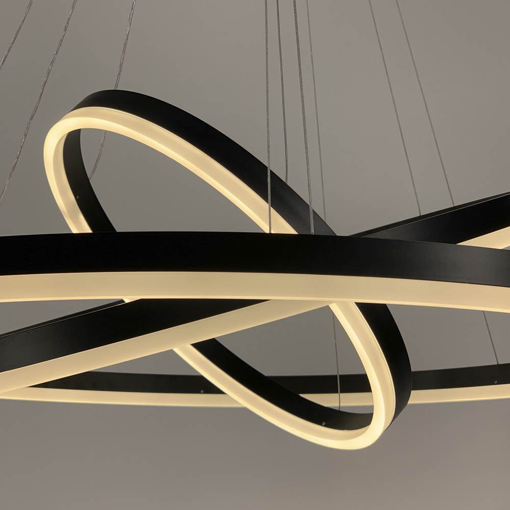 LED люстра на три кільця в чорному каркасі представлена у двох розмірах кілець: 60+40+20 см, потужність 107 Вт (51 Вт тепле та холодне світло) 80+60+40 см, потужність 152 Вт ( 73 Вт тепле та холодне світло). Люстра має три світлові режими, холодний.