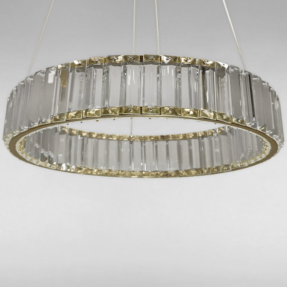 Підвісна LED люстра у формі кільця з кришталевими елементами, в сучасному стилі. Має три режими свічення: теплий, холодний, нейтральний. Без пульта дистанційного керування.
