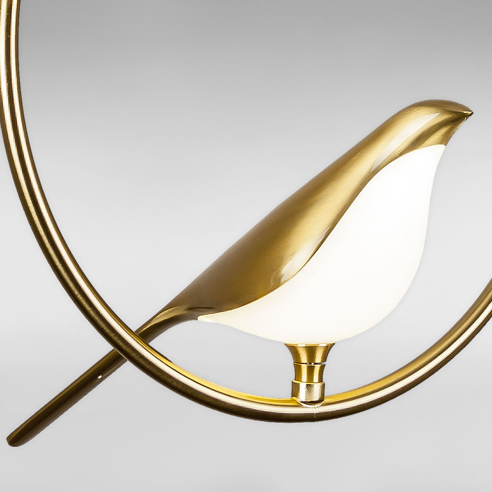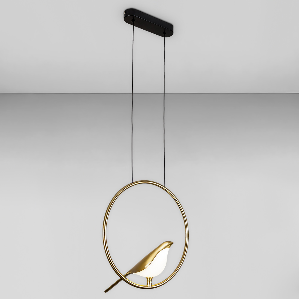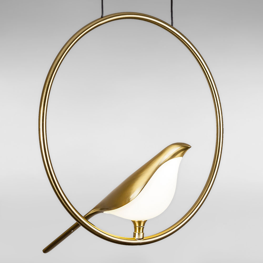 Підвісна декоративна LED люстра в сучасному стилі на одну джерело світла у вигляді світлодіодної пташки на металевому кільці.