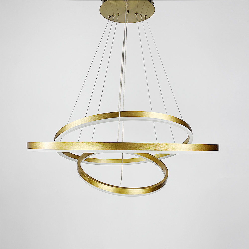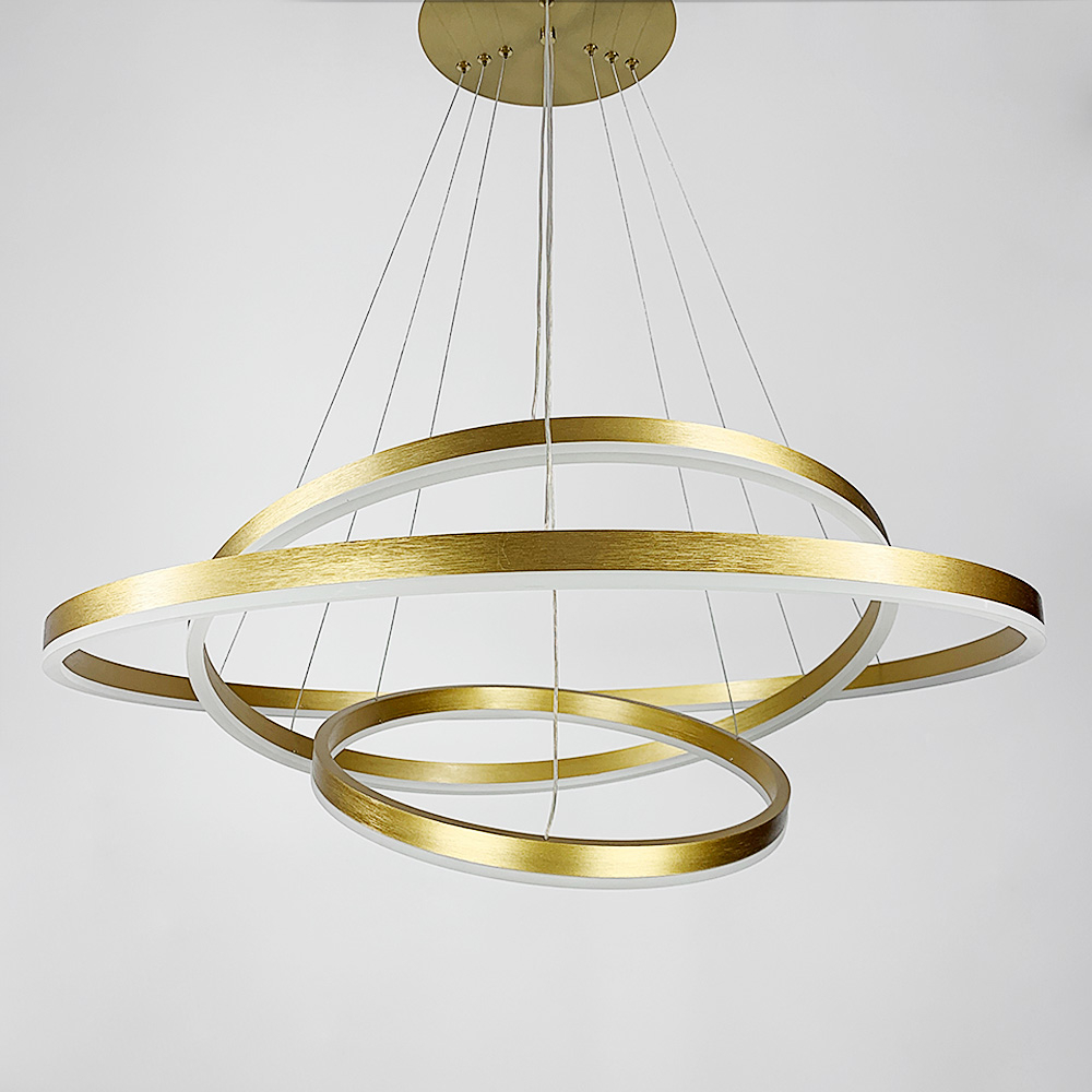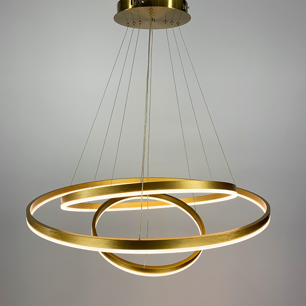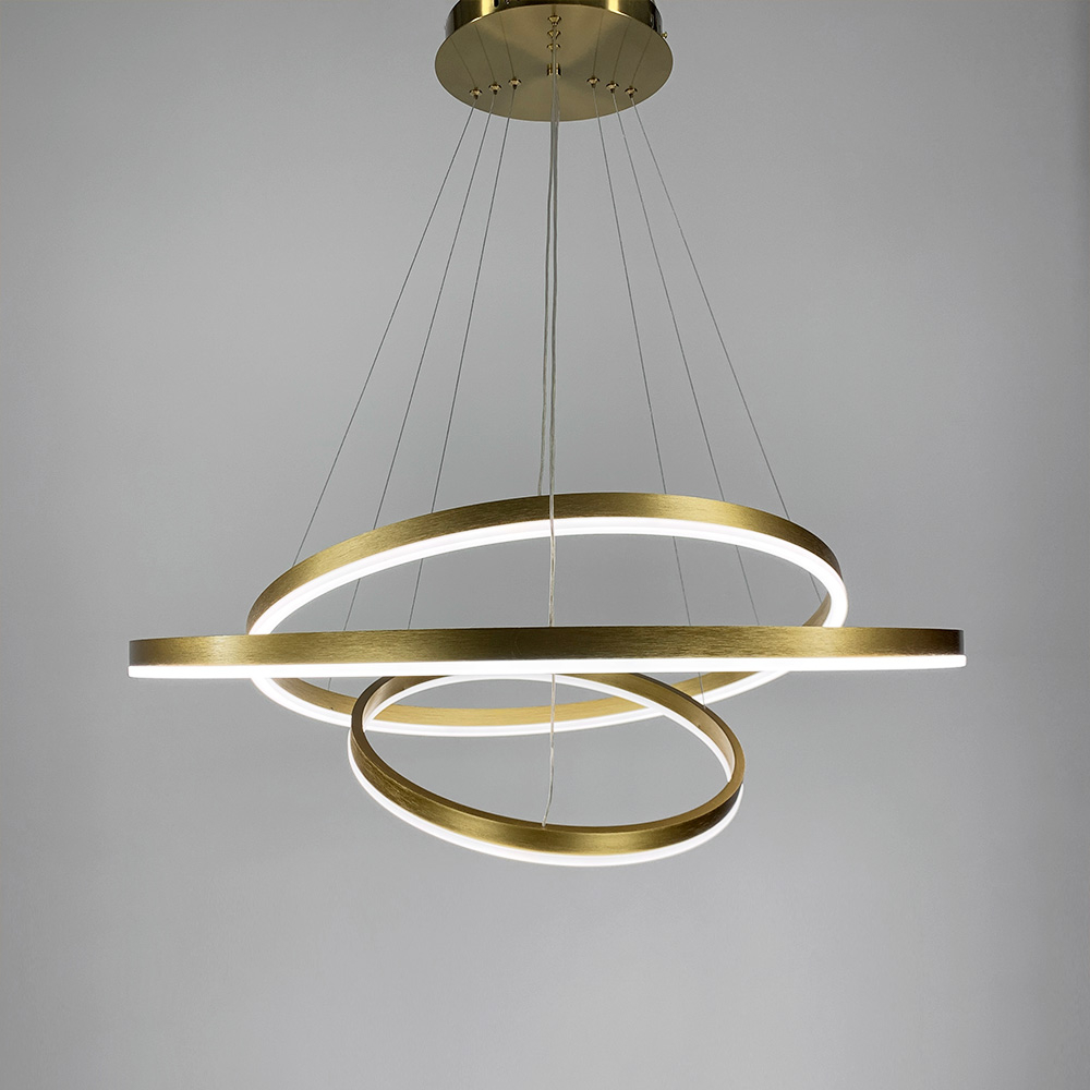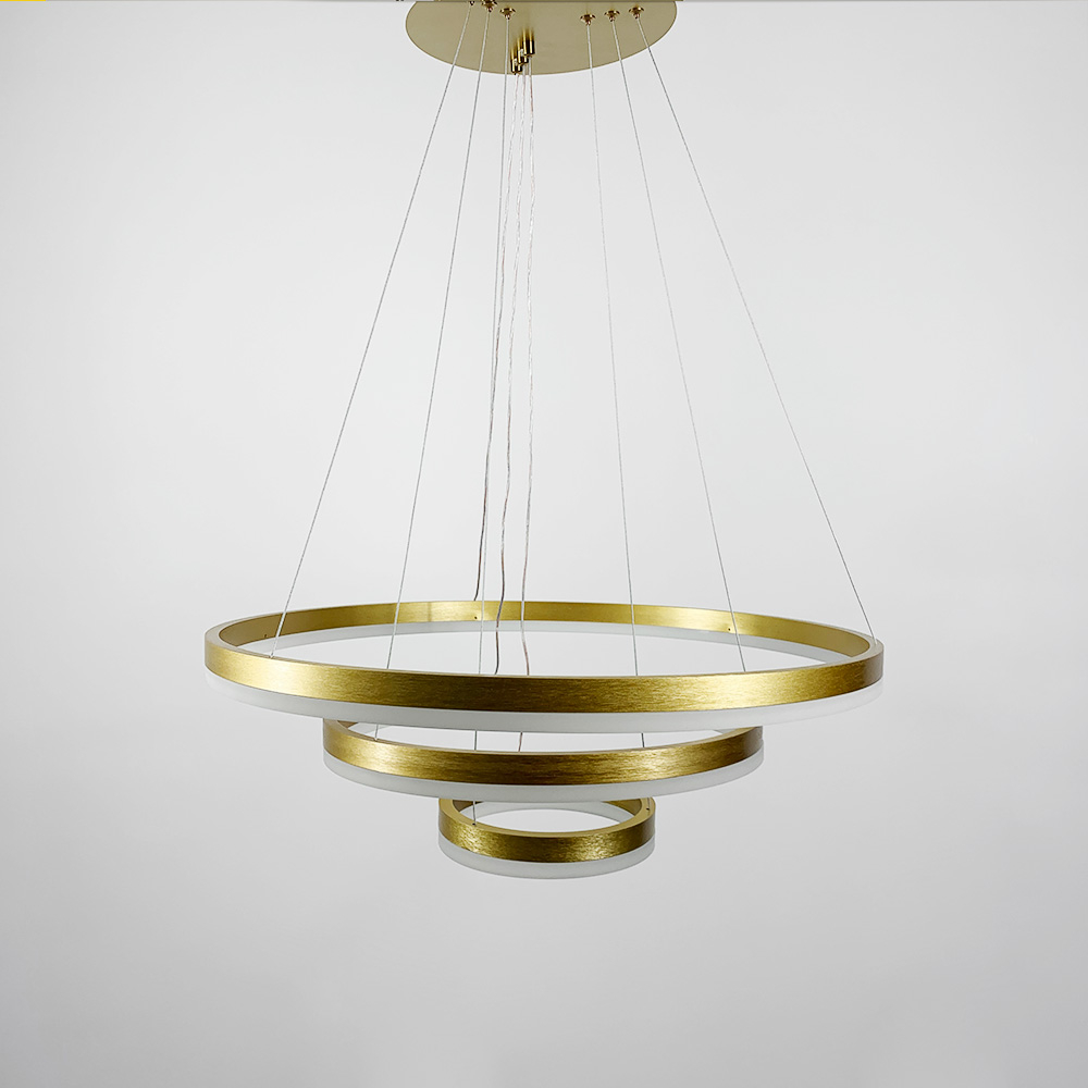 Спільна люстра латунь на три кільця 80+60+40 см, потужність 95 Вт (65 Вт тепле та холодне світло) Люстра має три світлові режими, які включаються послідовно: холодний, теплий, нейтральний. Особливістю даної моделі є можливість регулювати висоту та виставляти бажане положення кілець. Вони можуть розміщуватись як горизонтально один щодо одного, так і під різними кутами нахилу, створюючи свою унікальну світлову композицію.