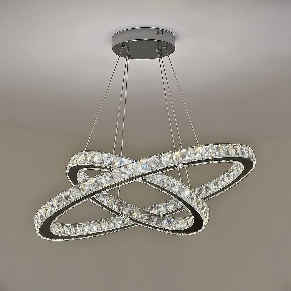 Елегантна підвісна світлодіодна люстра у сучасному стилі, на два джерела світла у вигляді LED кілець із кришталевими вставками. Люстра оснащена пультом керування з функцією регулювання яскравості та температури світла.