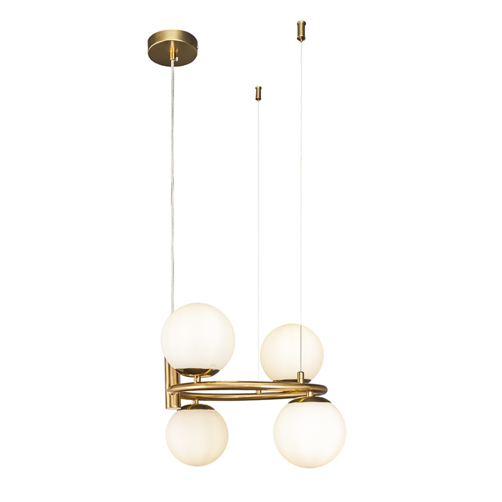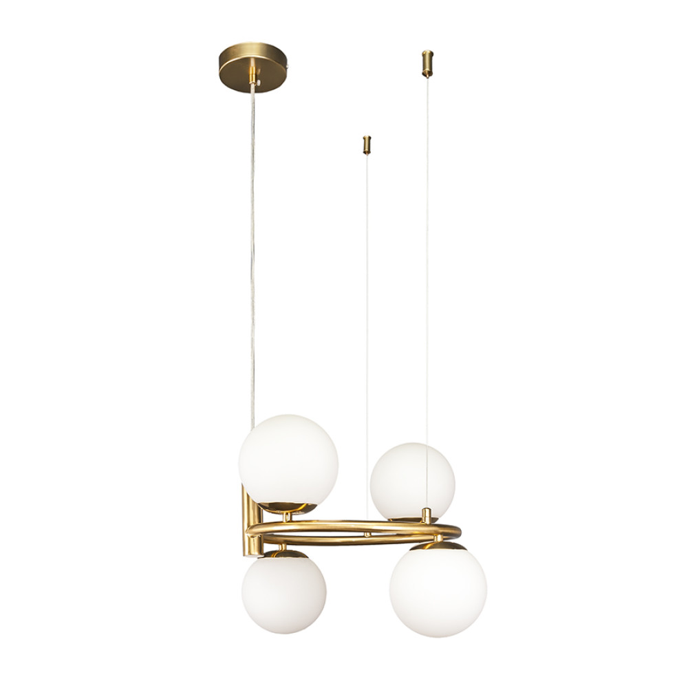 Підвісна люстра з корпусом у вигляді кільця, на чотири лампи зі скляними плафонами сферичної форми. Найкраще використовувати у приміщенні загальною площею 12 м ². Ви отримаєте якісне освітлення, яке дозволить комфортно читати, писати чи вишивати. Іншими словами, це буде яскраво.