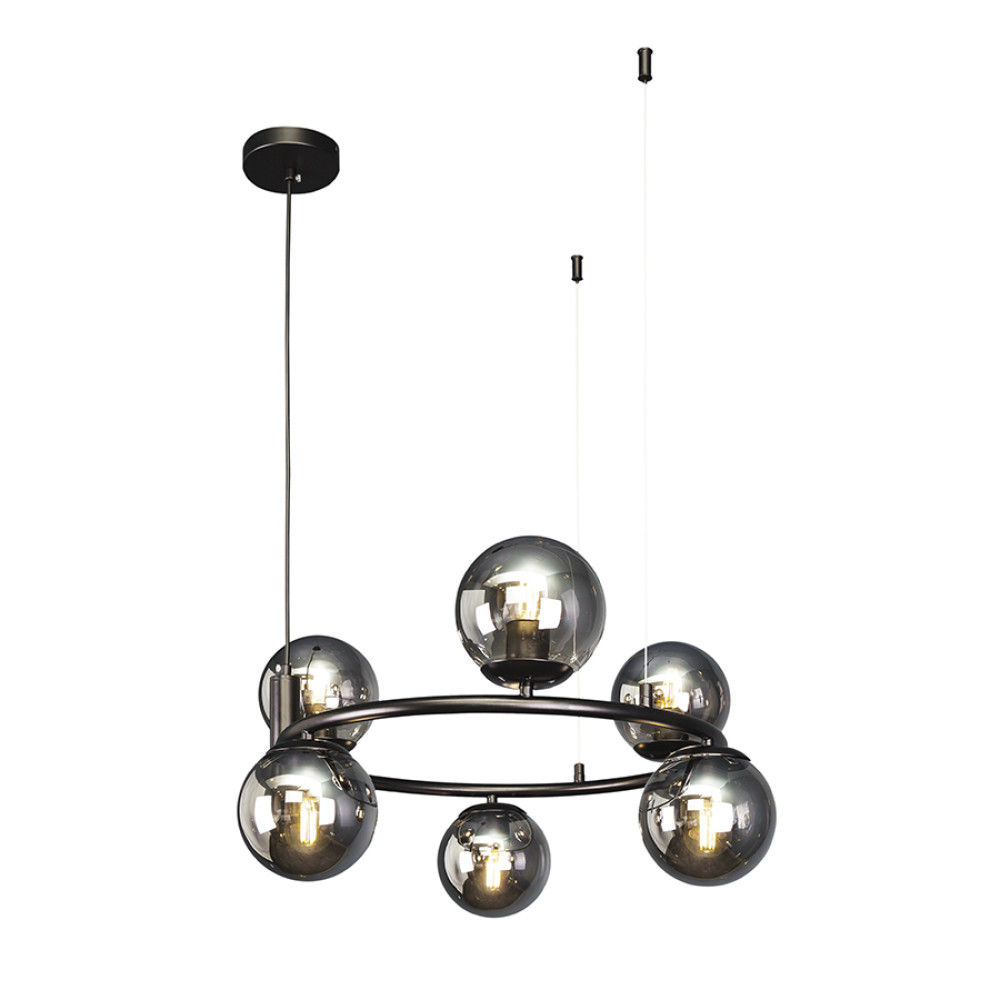 Підвісна люстра з корпусом у вигляді кільця на шість ламп зі скляними плафонами сферичної форми. Найкраще використовувати у приміщенні загальною площею 18 м². Ви отримаєте якісне освітлення, яке дозволить комфортно читати, писати чи вишивати. Іншими словами, це буде яскраво.