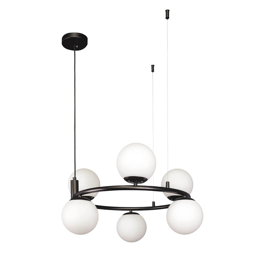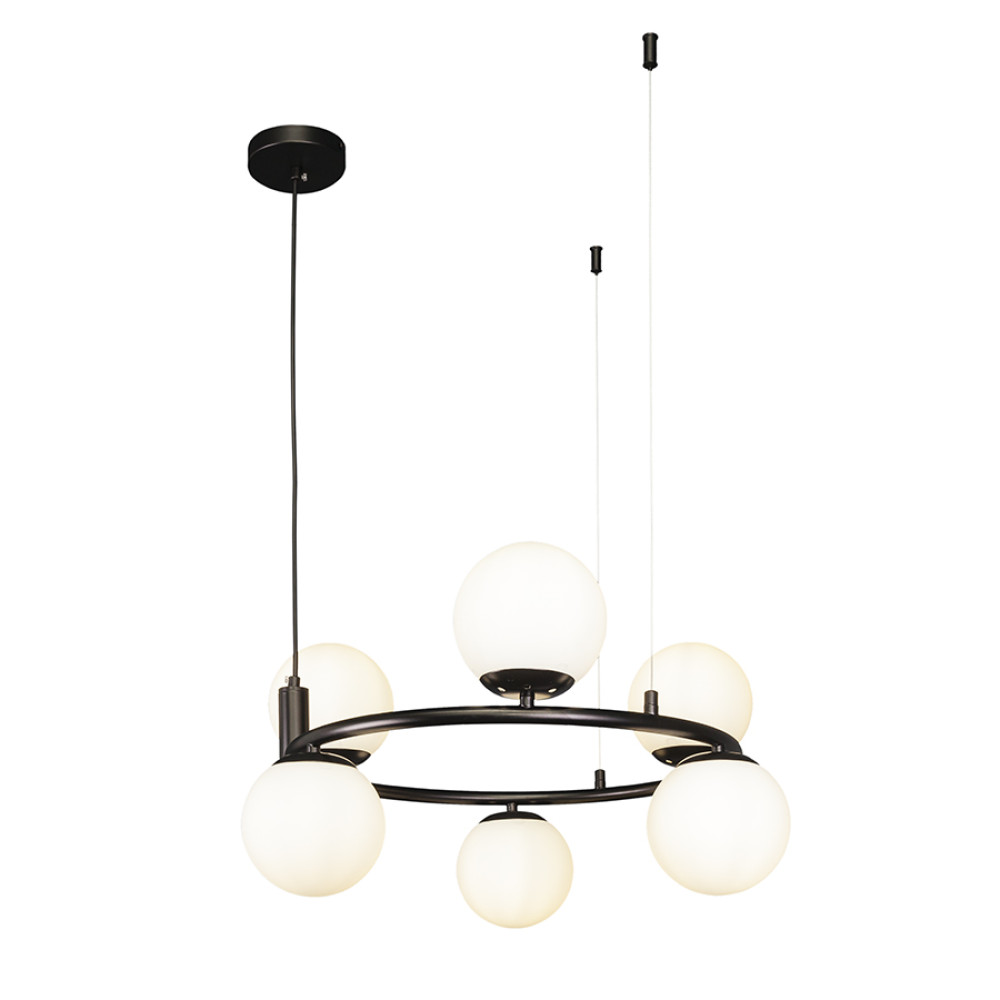 Підвісна люстра з корпусом у вигляді кільця на шість ламп зі скляними плафонами сферичної форми. Найкраще використовувати у приміщенні загальною площею 18 м². Ви отримаєте якісне освітлення, яке дозволить комфортно читати, писати чи вишивати. Іншими словами, це буде яскраво.