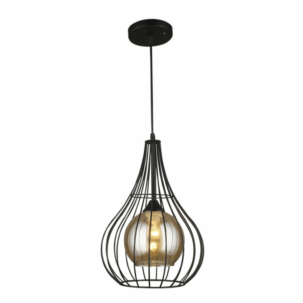 Підвіс виготовлений із чорного металу, що створює стильний контраст із прозоро-бронзовим скляним плафоном усередині каркасу. Цей дизайн надає люстру сучасний та промисловий вигляд, характерний для стилю лофт.