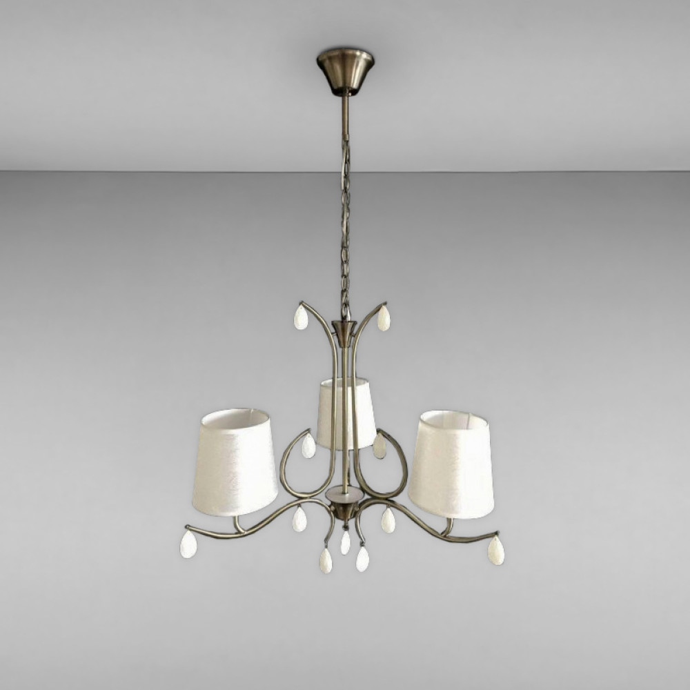 Люстра на три лампи, з абажурами і білими з підвісками.