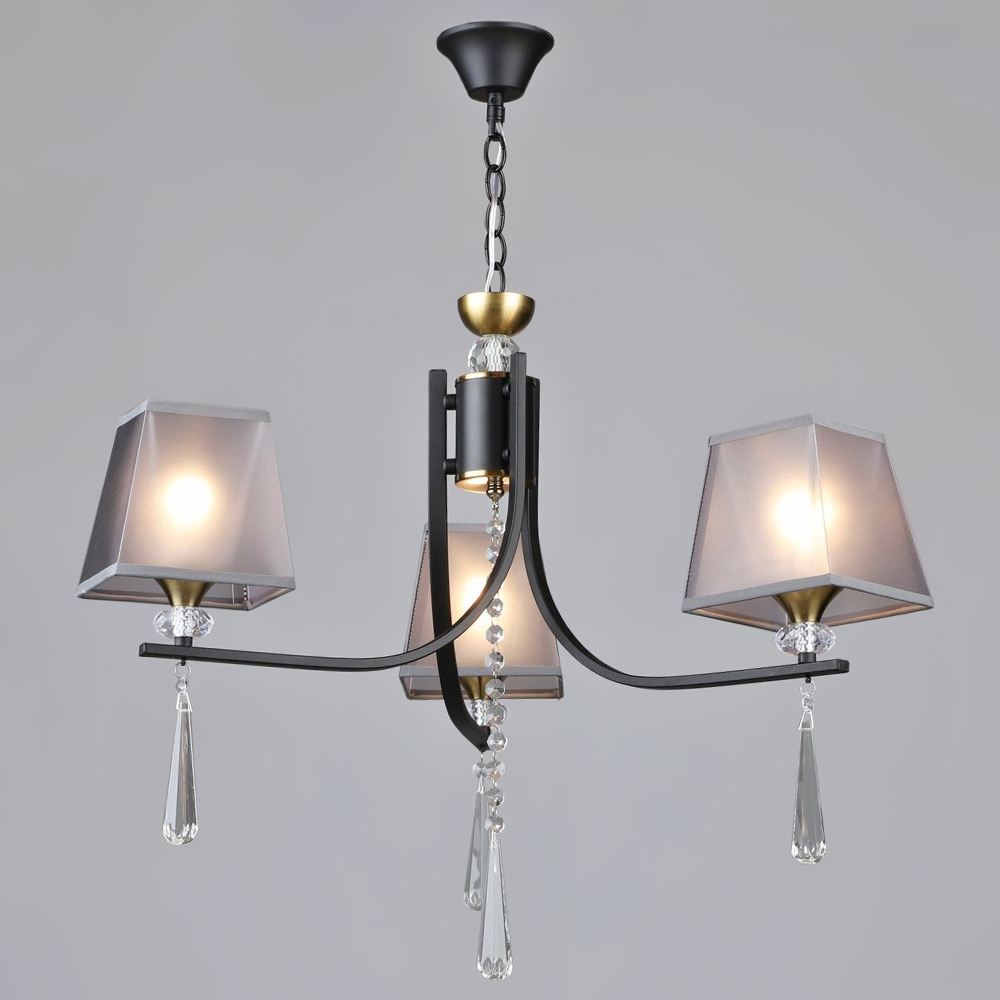Каркас виготовлений із високоякісного металу чорного та золотого кольору, що створює розкішний контраст та надає люстру класичного шику. Три текстильні плафони сірого відтінку гармонійно доповнюють дизайн, надаючи приміщенню затишку та м'якість.