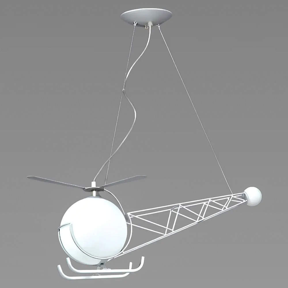 Дитяча декоративна підвісна люстра на одну лампу з плафоном форми кулі та корпусом у вигляді вертольота.