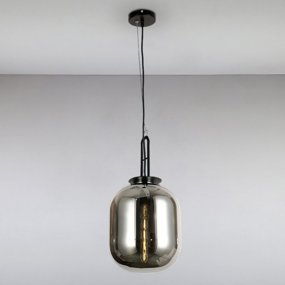 Люстру підвіс на одну лампу в стилі лофт із чорного металу та з плафоном із чорного скла у вигляді кулі, можна купити у нашому магазині.