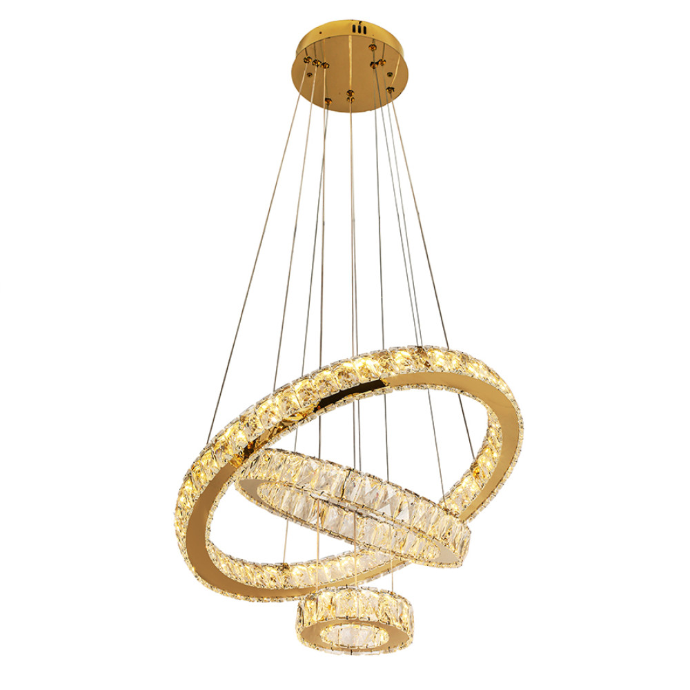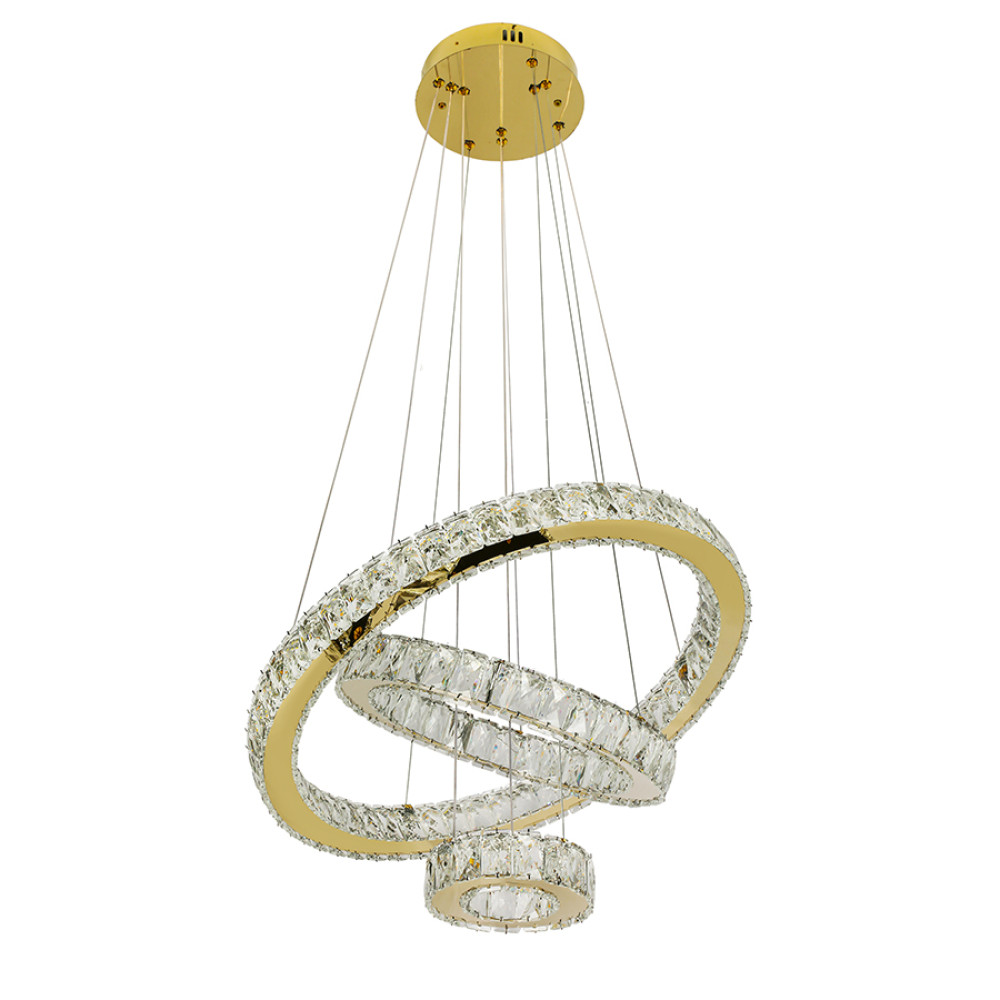 Сучасна декоративна підвісна LED люстра на три джерела світла з регулюванням колірної температури та пультом управління. Незвичайний дизайн люстри представлений у вигляді трьох світлодіодних кілець різних діаметрів. Конструкція кілець складається з основи золотого кольору, на яку кріпляться декоративні прямокутні скляні камінці, що м'яко розсіюють світло і створюють розкішний блискучий ефект.