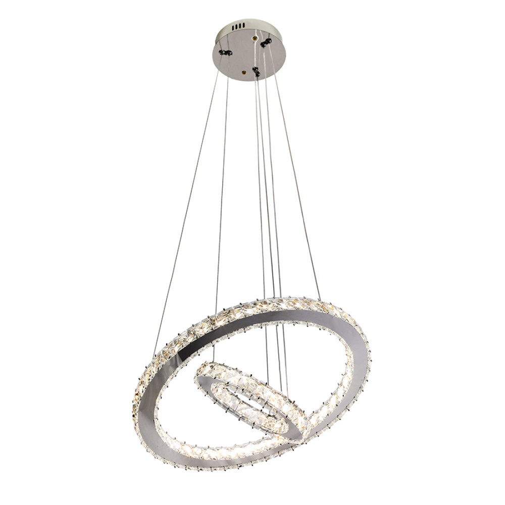 Сучасна декоративна підвісна LED люстра на два джерела світла з регулюванням колірної температури та пультом управління. Незвичайний дизайн люстри представлений у вигляді двох світлодіодних кілець різних діаметрів. Конструкція кілець складається з основи хромового кольору, на яку кріпляться декоративні прямокутні скляні камінці, що м'яко розсіюють світло і створюють розкішний блискучий ефект.