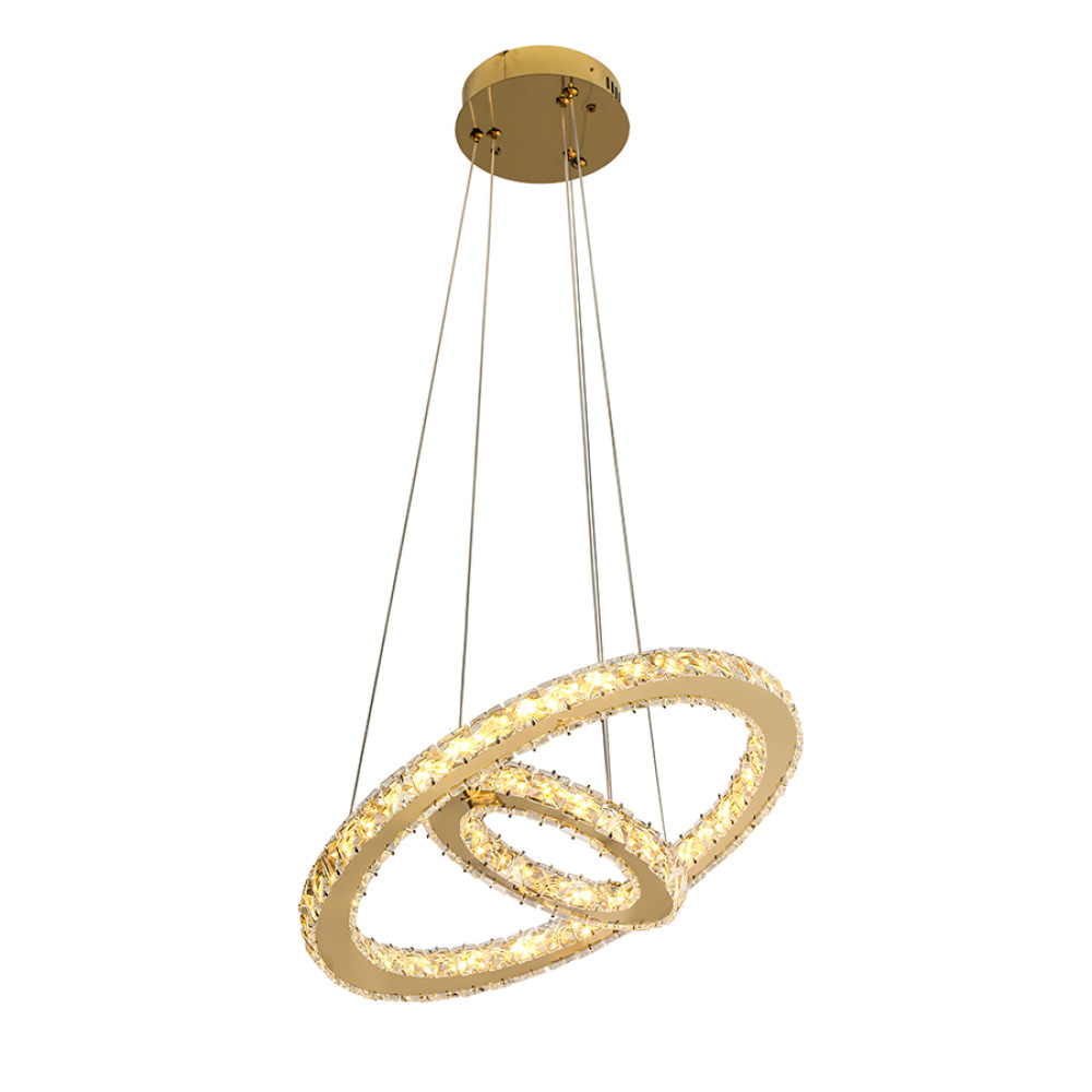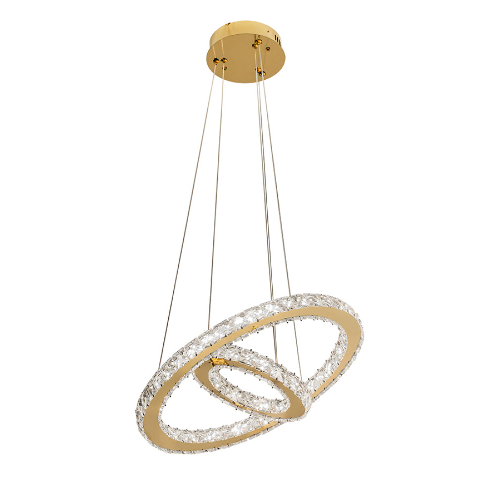 Сучасна декоративна підвісна LED люстра на два джерела світла з регулюванням колірної температури та пультом управління. Незвичайний дизайн люстри представлений у вигляді двох світлодіодних кілець різних діаметрів. Конструкція кілець складається з основи золотого кольору, на яку кріпляться декоративні прямокутні скляні камінці, що м'яко розсіюють світло і створюють розкішний блискучий ефект.