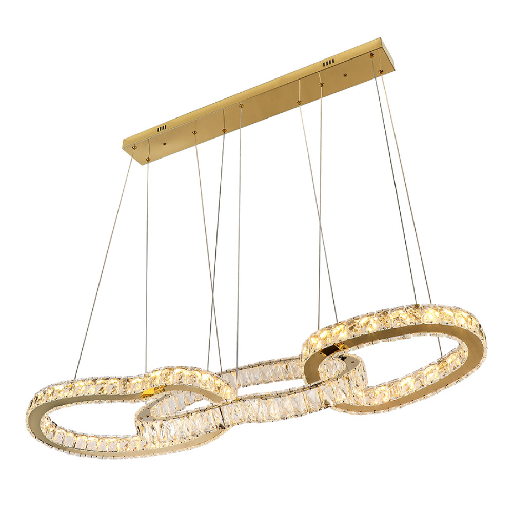 Сучасна декоративна підвісна LED люстра на три джерела світла з регулюванням колірної температури та пультом управління. Незвичайний дизайн люстри представлений у вигляді трьох світлодіодних овальних кілець які горизонтально з'єднані як ланки ланцюга. Конструкція кілець складається з основи золотого кольору, на яку кріпляться декоративні прямокутні скляні камінці, що м'яко розсіюють світло і створюють розкішний блискучий ефект.