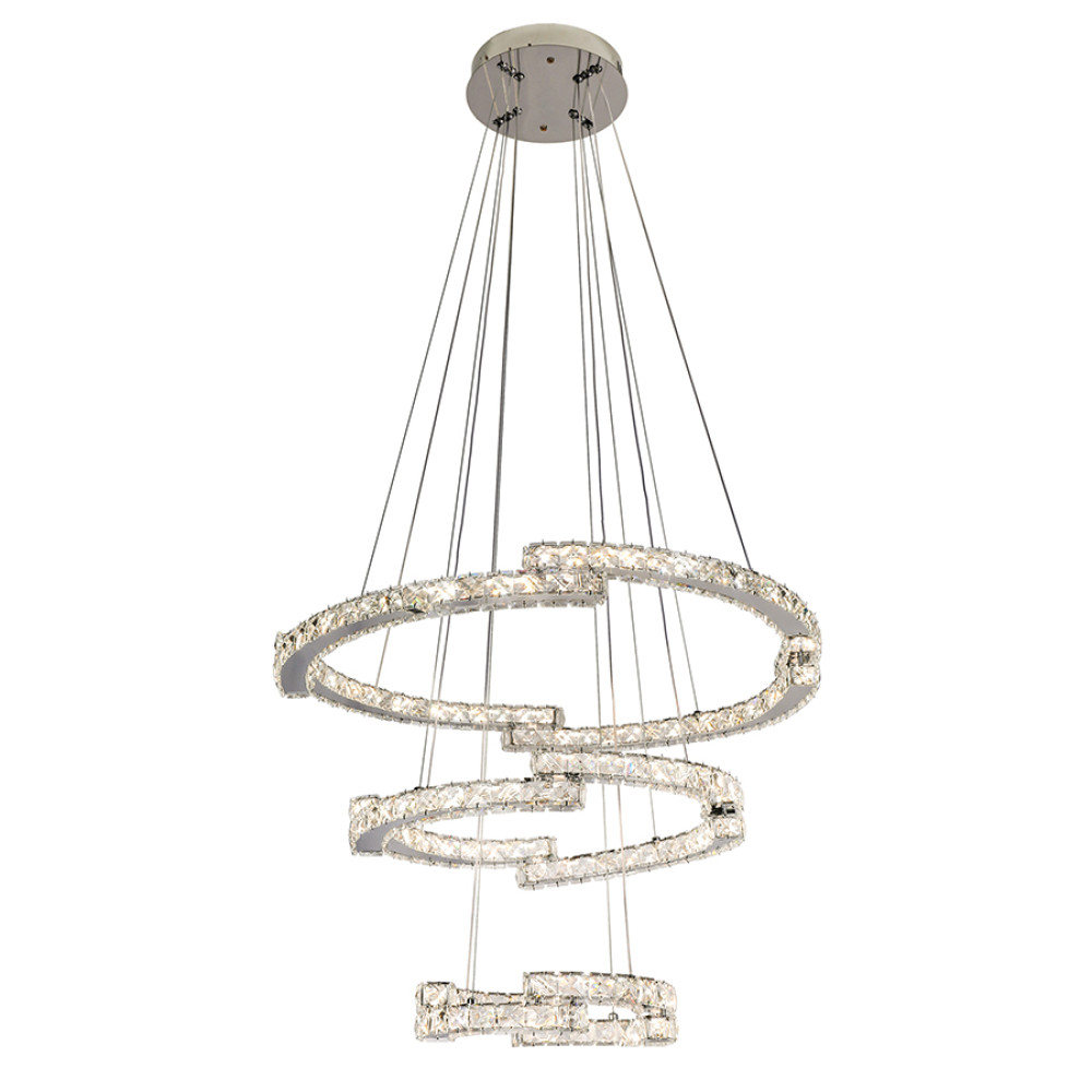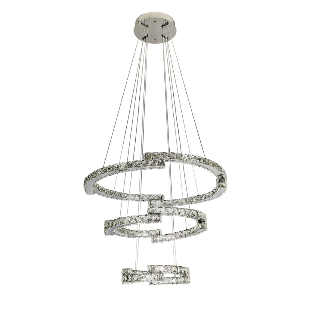 Сучасна декоративна підвісна LED люстра на три джерела світла з регулюванням колірної температури та пультом управління. Незвичайний дизайн люстри представлений у вигляді трьох світлодіодних кілець різних діаметрів. Кожне кільце складається з чотирьох окремих секторів з основою хромового кольору, на яку кріпляться декоративні прямокутні скляні камінці: що м'яко розсіюють світло і створюють розкішний блискучий ефект.