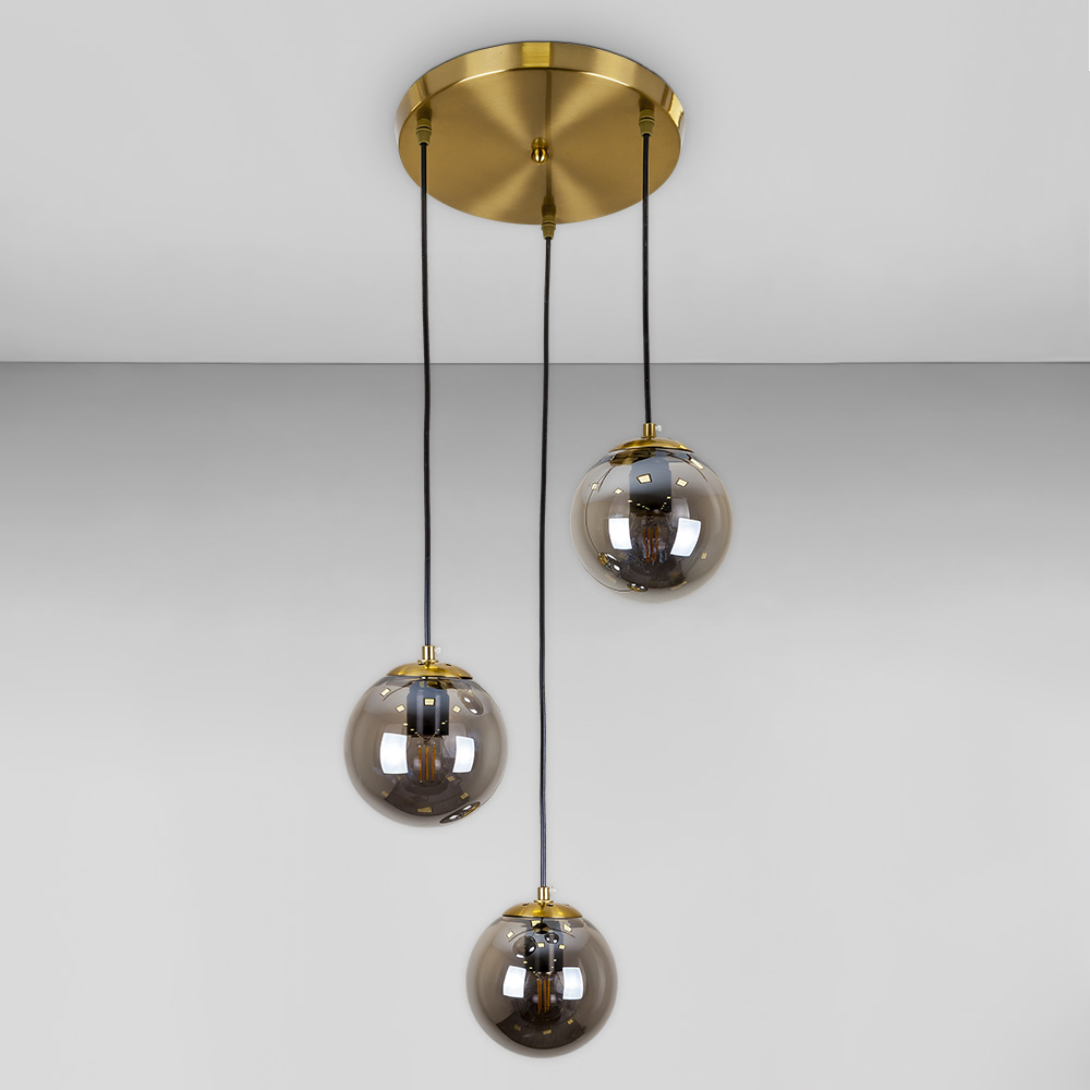 Підвісна люстра на три лампи в сучасному стилі зі скляними плафонами у вигляді кулі.