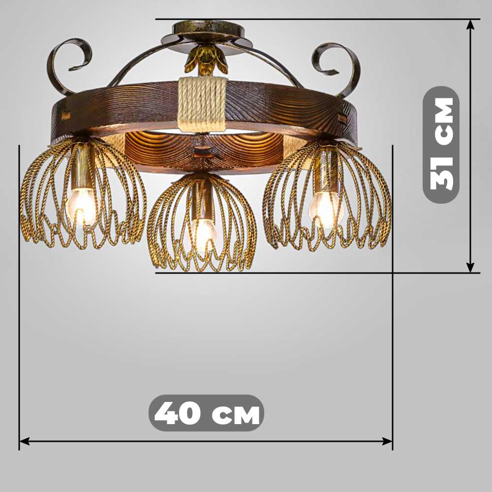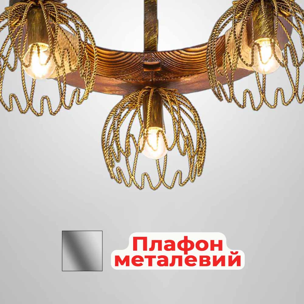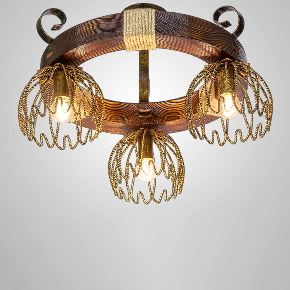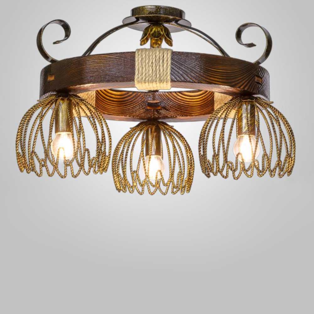 Декоративна стельова люстра в стилі Кантрі, на три лампи з металевими плафонами на дерев'яному корпусі у вигляді кільця.