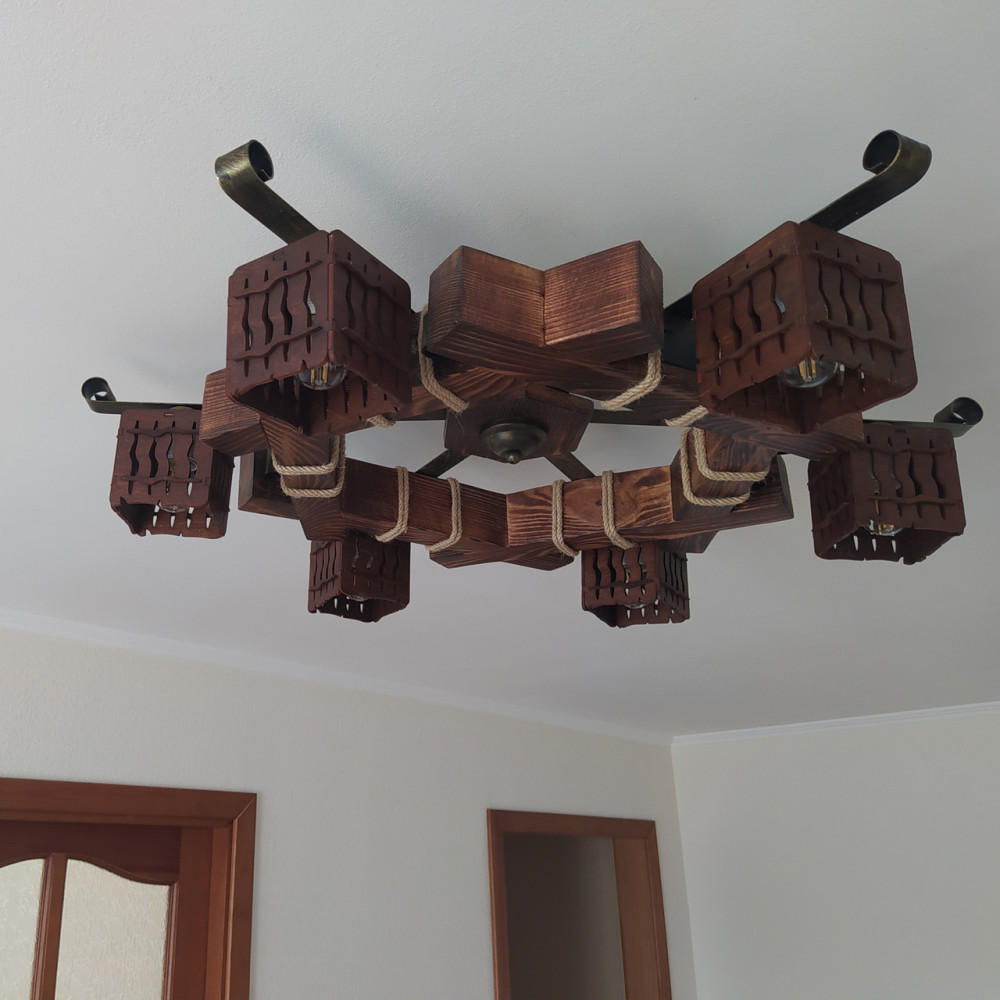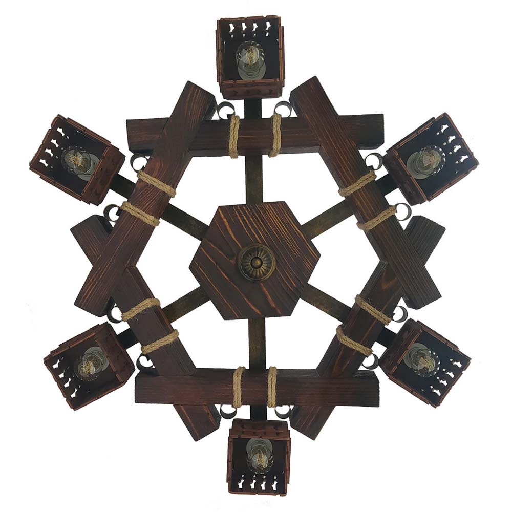 Дерев'яна стельова люстра (стель) у стилі Кантрі на шість ламп з квадратними плафонами.