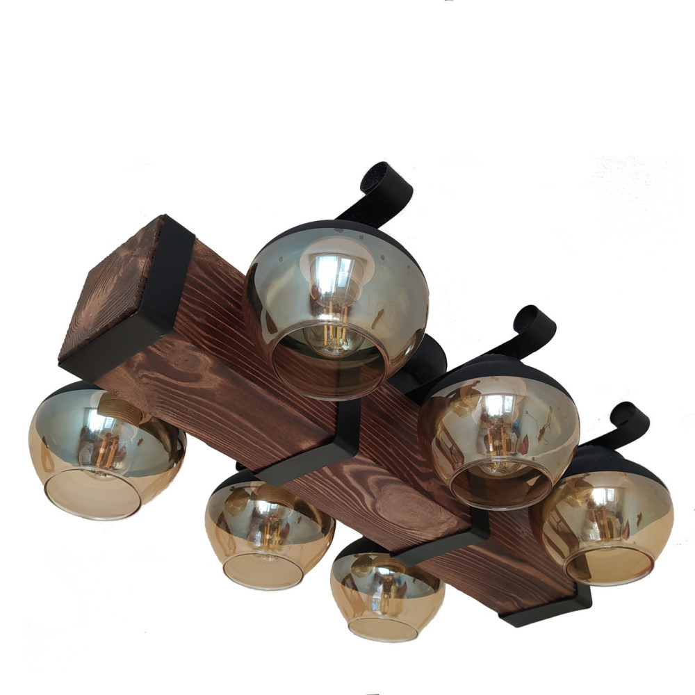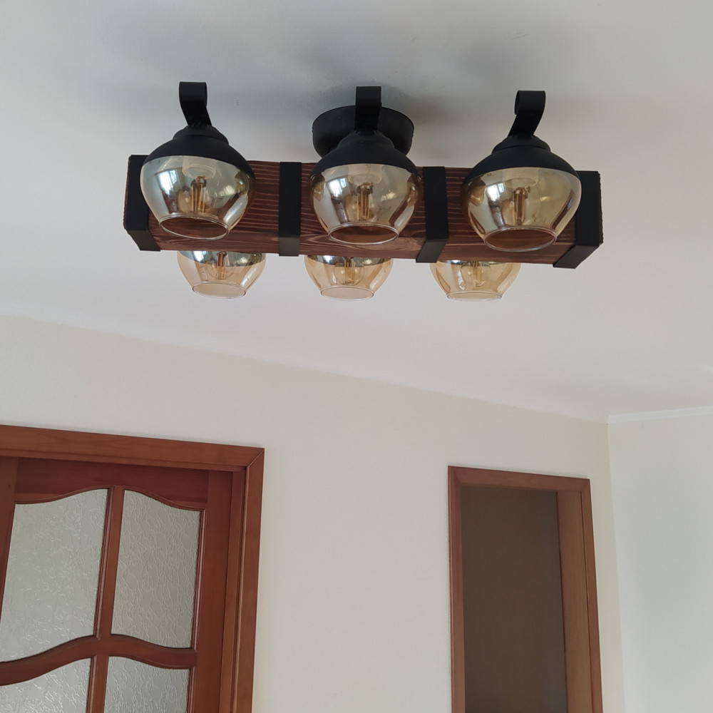 Стельова люстра в стилі Кантрі на шість ламп з дерев'яним корпусом у вигляді балки зі скляними плафонами на обидва боки.