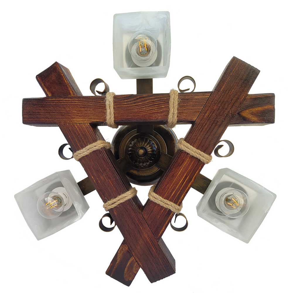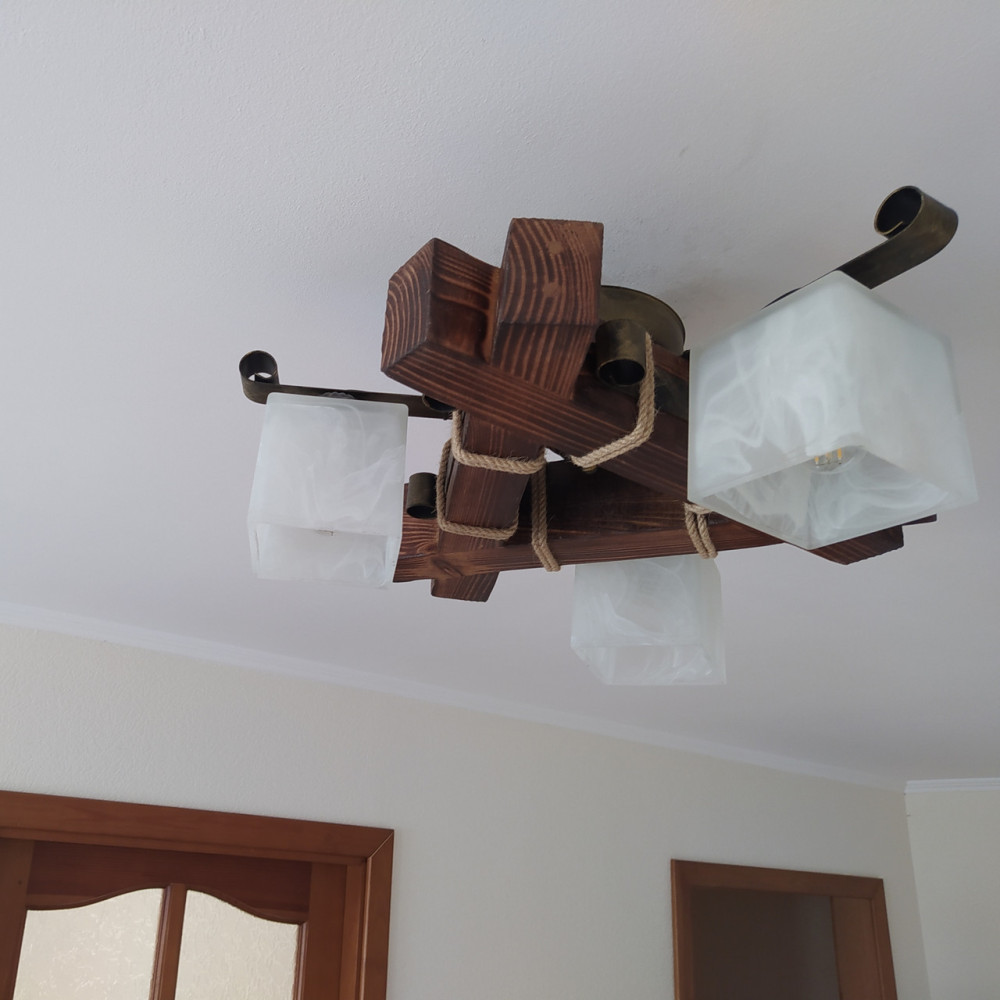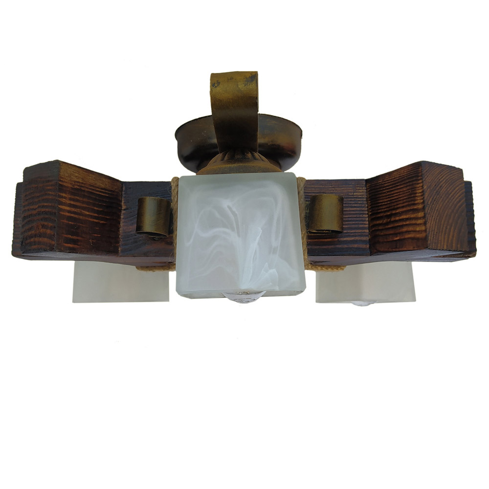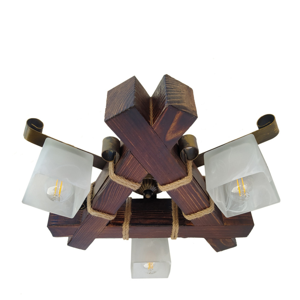 Декоративна стельова люстра у стилі Кантрі, на три лампи зі скляними квадратними плафонами та дерев'яним корпусом.