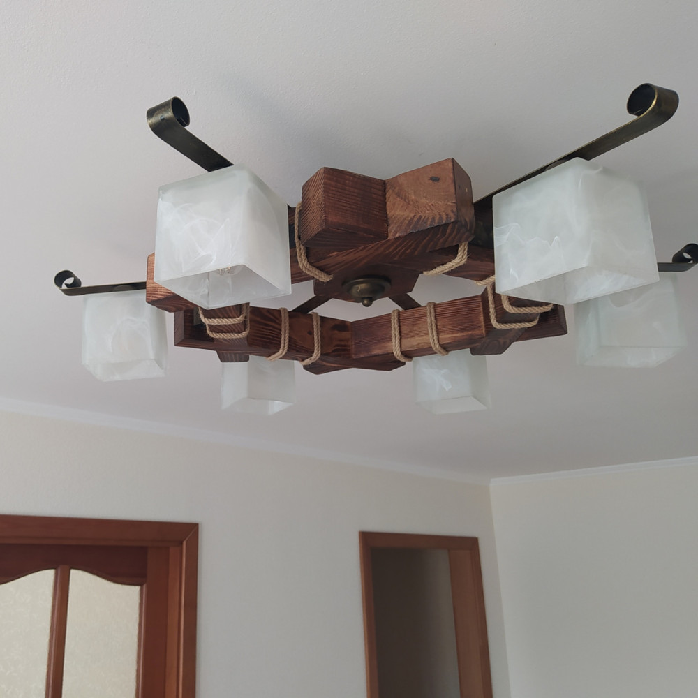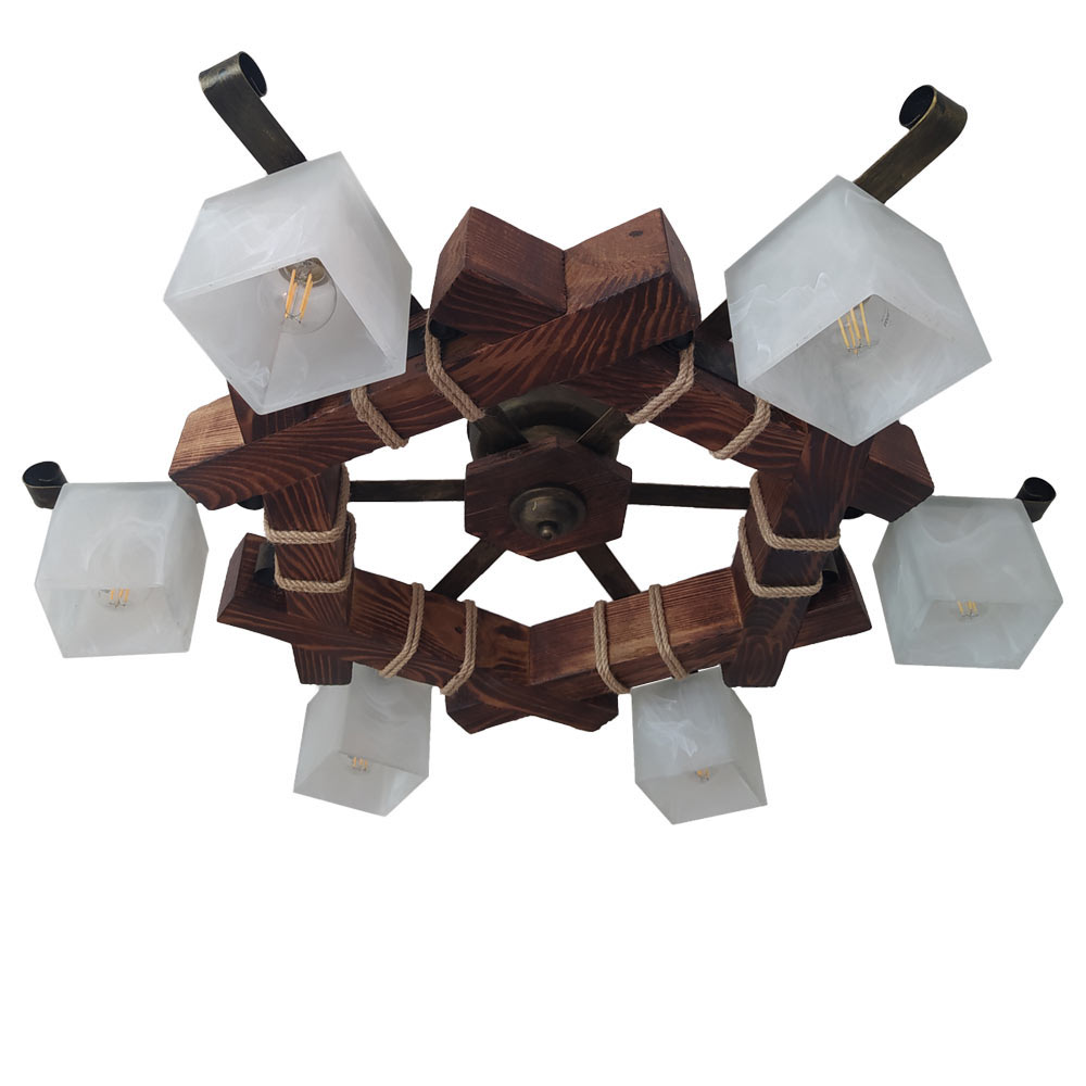 Декоративна стельова люстра у стилі Кантрі, на шість ламп зі скляними квадратними плафонами та дерев'яним корпусом.