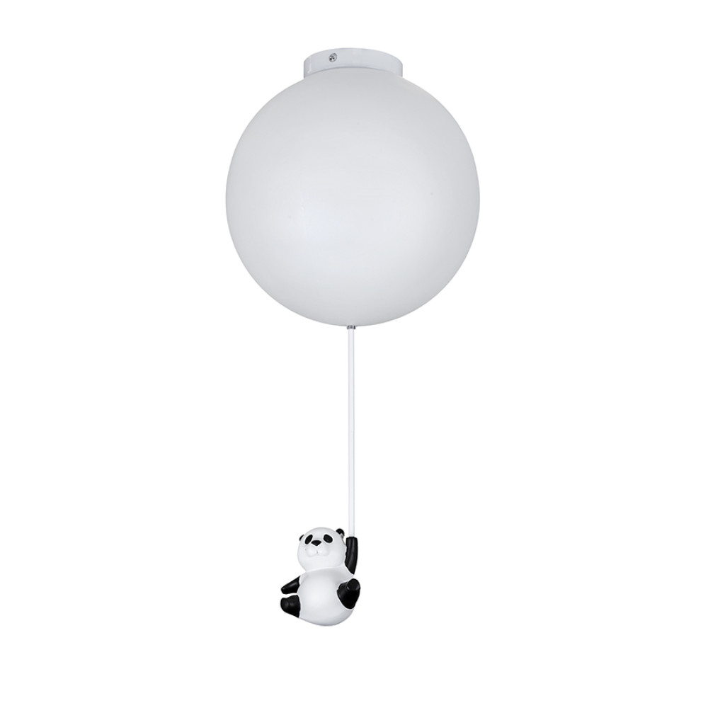 Дитяча стельова люстра на одну лампу з круглим плафоном та декоративною фігуркою панди, що звисає з плафону.