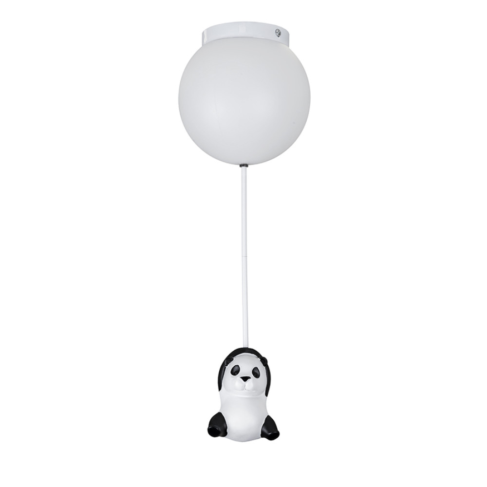 Дитяча стельова люстра на одну лампу з круглим плафоном та декоративною фігуркою панди, що звисає з плафону.