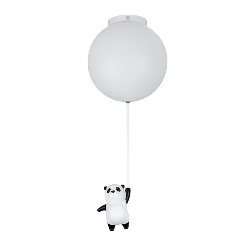 Дитяча стельова люстра на одну лампу з круглим плафоном та декоративною фігуркою панди, що звисає з плафону.