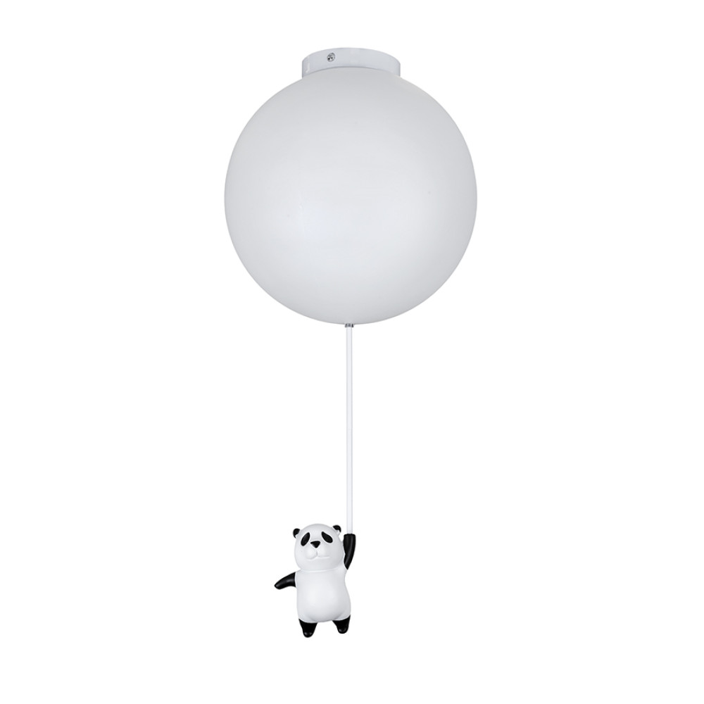 Дитяча стельова люстра на одну лампу з круглим плафоном та декоративною фігуркою панди, що звисає з плафону.