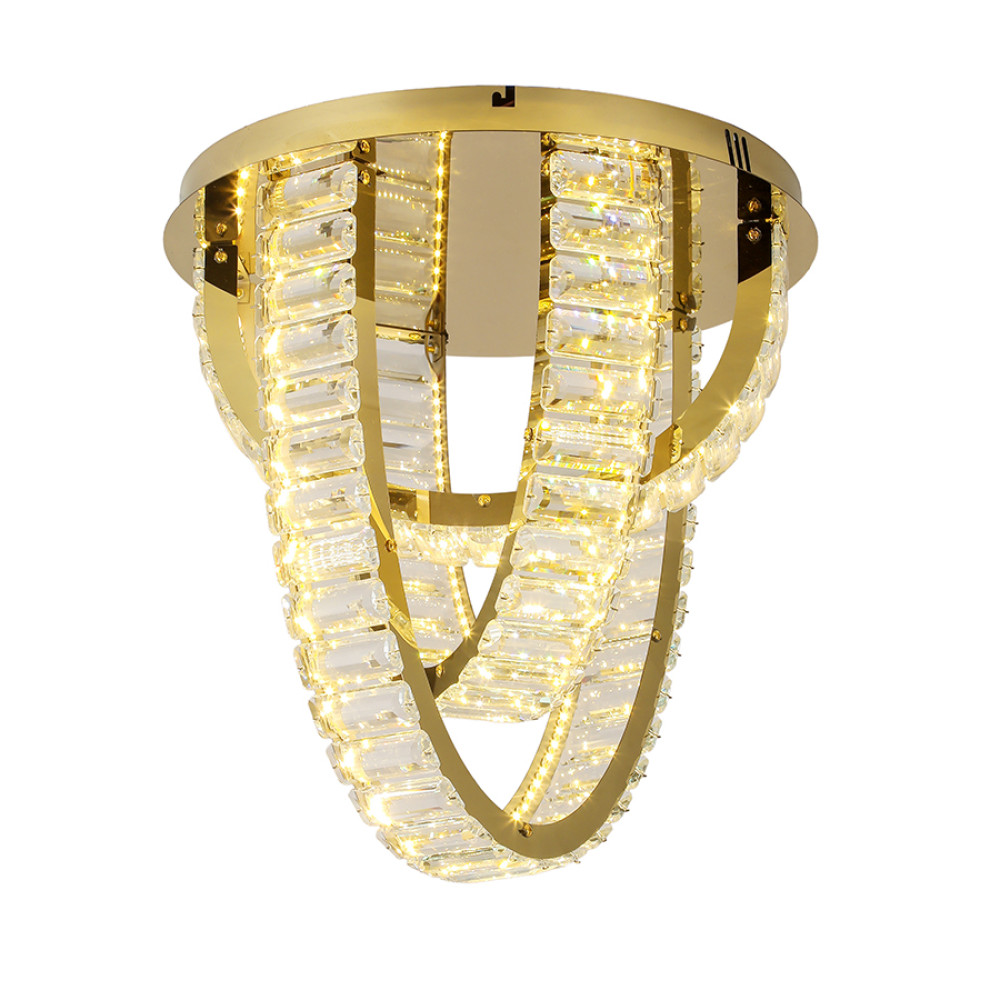 Сучасна кришталева стельова LED-люстра з регулюванням колірної температури, без пульта управління. Незвичайний дизайн люстри представлений у вигляді трьох дугоподібних пластин різної довжини, із вбудованими світлодіодами та декоративними прямокутними скляними камінцями, які м'яко розсіюють світло і створюють розкішний блиск у поєднанні із дзеркальним злотим корпусом.