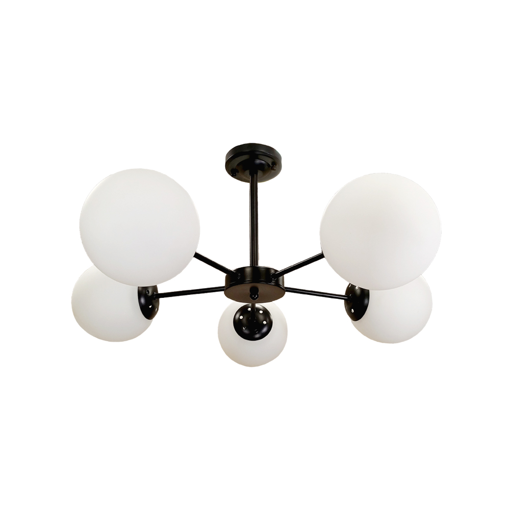 Стельова люстра на п'ять ламп з плафонами сферичної форми.