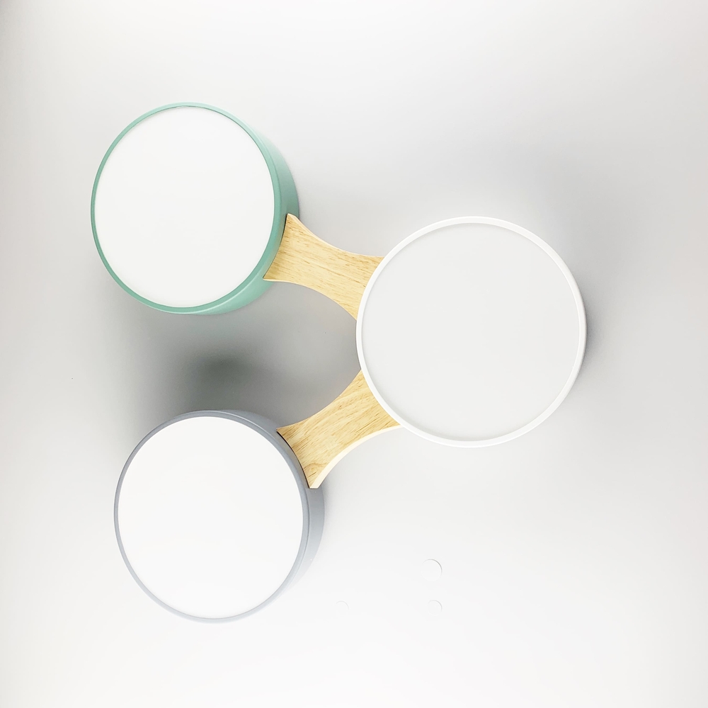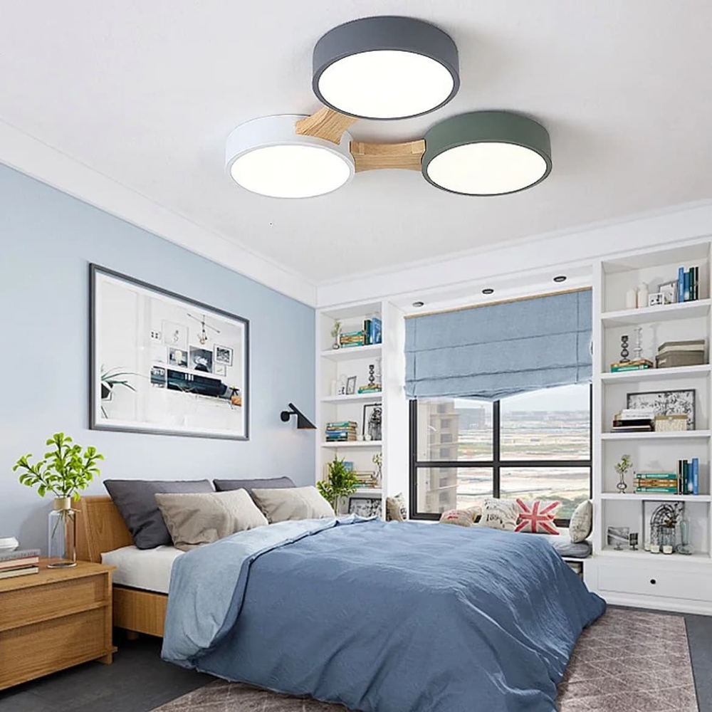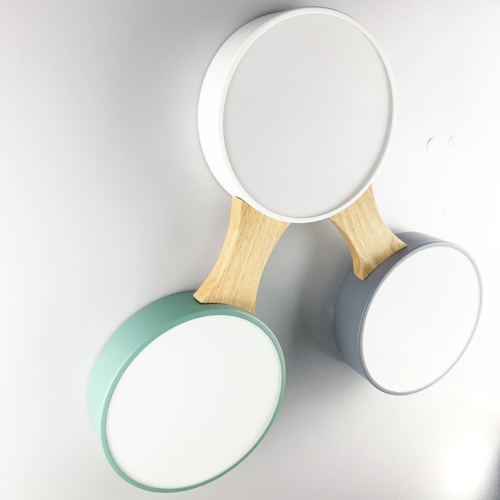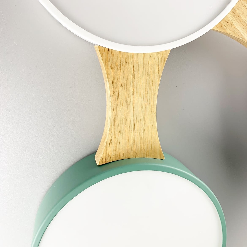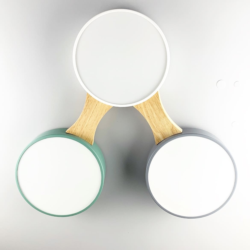 Стельова світлодіодна люстра в сучасному стилі, на три джерела світла круглої плоскої форми, з дерев'яними елементами, без пульта керування.