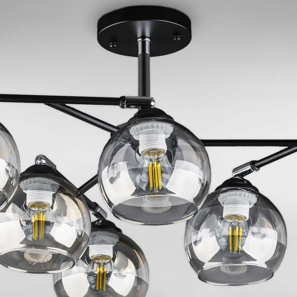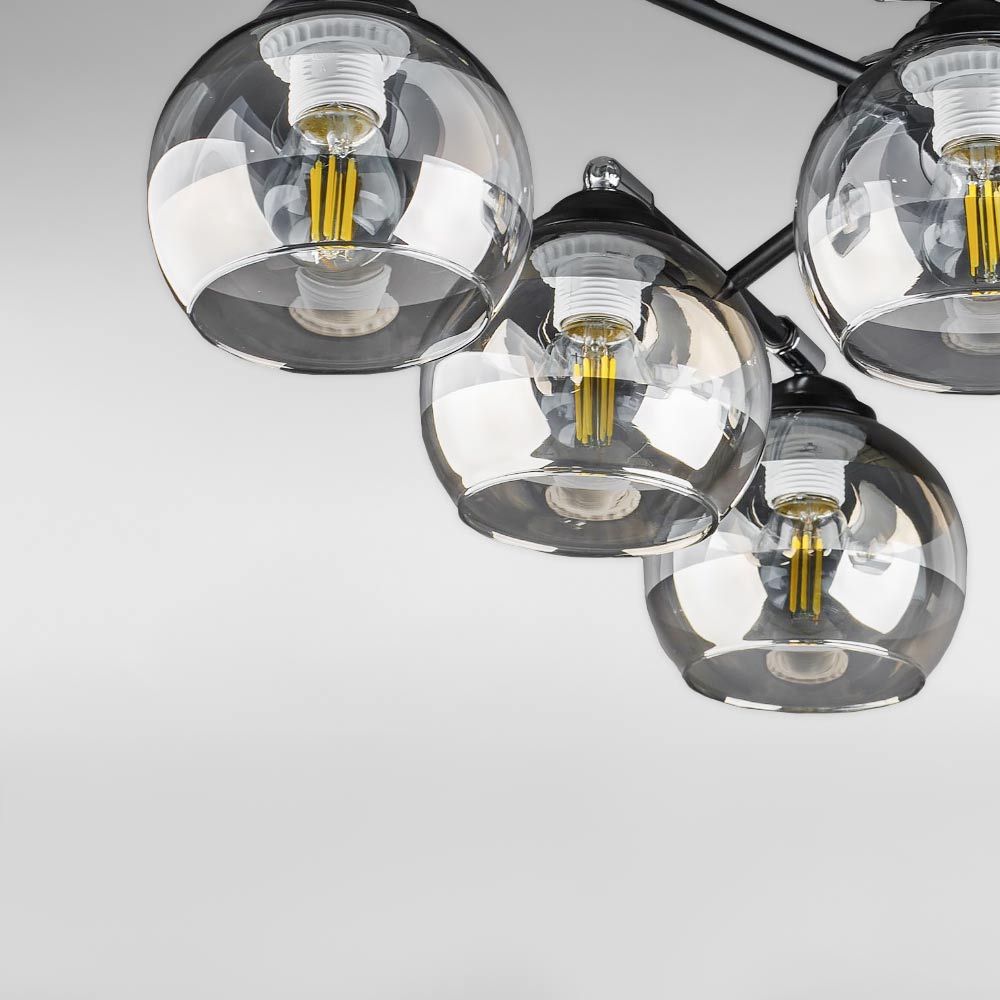 Стильна стельова люстра на шість ламп зі скляними плафонами круглої форми.